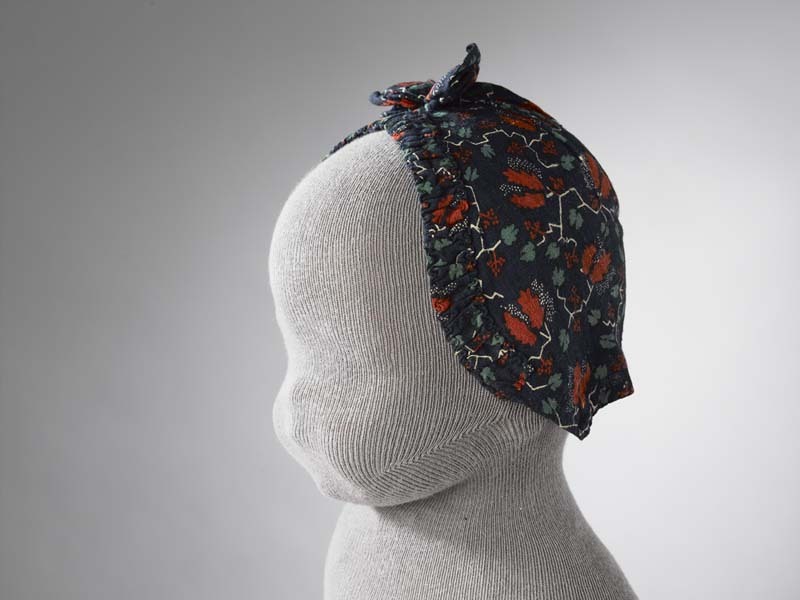 Mutsje van bedrukt katoen, op donkerblauwe ondergrond, roodbruine gestyleerde bloemen en groene blaadjes, langs de voorzijde een ruche, op het mutsje een strikje