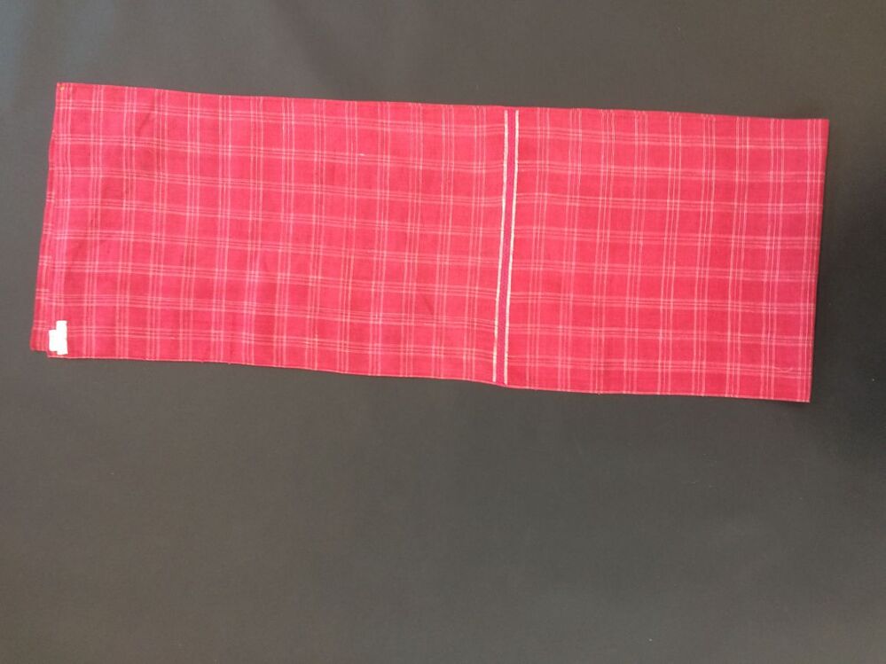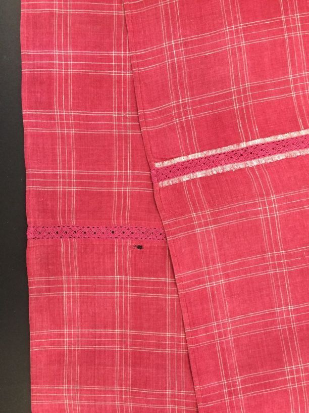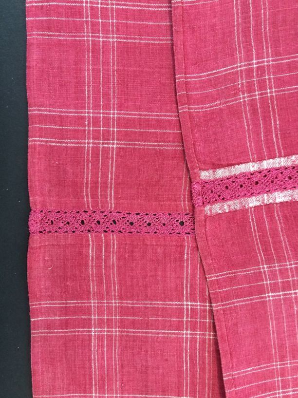 Hindelooper schoorsteenval van rood-wit bont met rood zijden kanten tussenzetsels