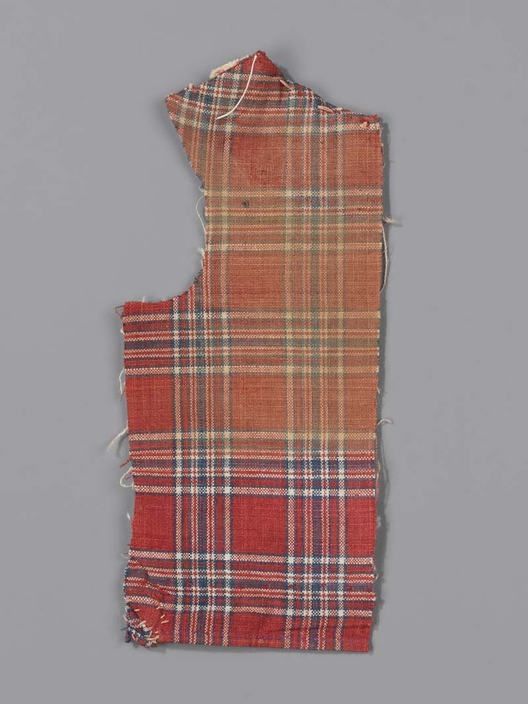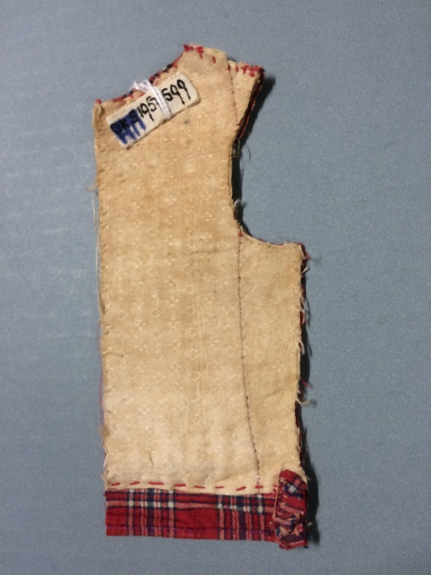 Fragment van poppenjakje, rode grond, blauw-wit geruit