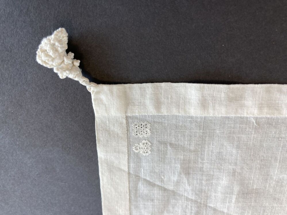 Halsdoek van wit linnen met 4 akertjes met in de linkeronderhoek de initialen M.T.