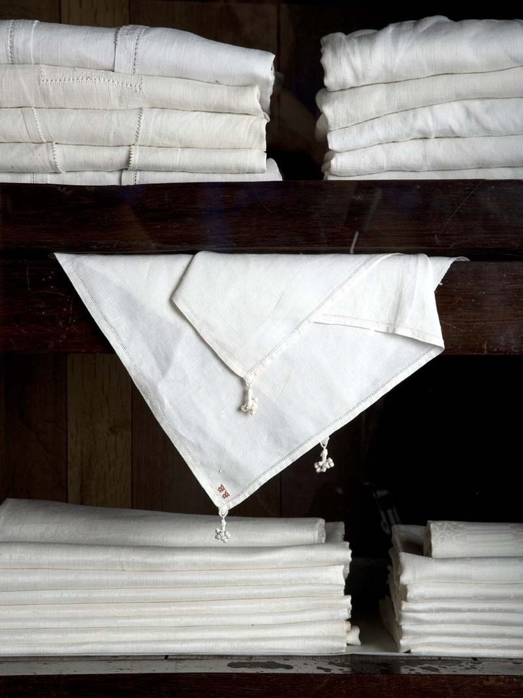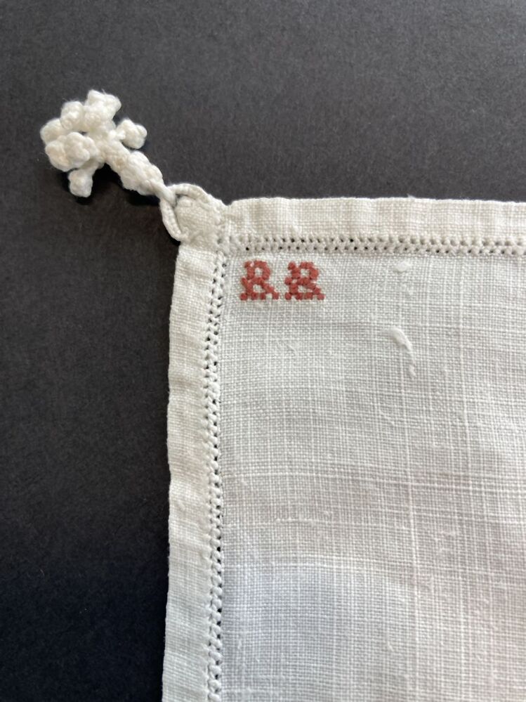 Zakdoek van wit linnen met in linkerbovenhoek de initialen RR