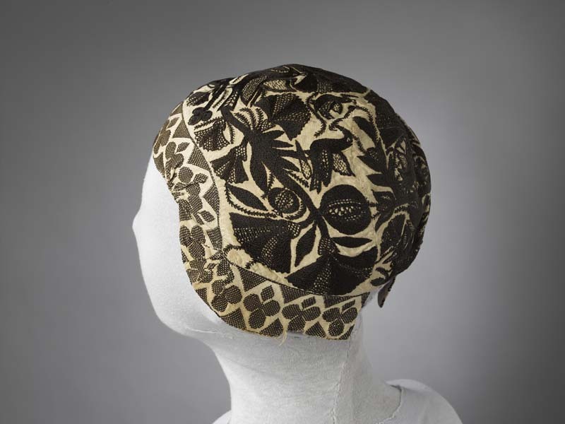 Huismuts of ondermuts van wit linnen, geborduurd met zwart garen, bloem en vogelmotieven, langs de rand zwart langet