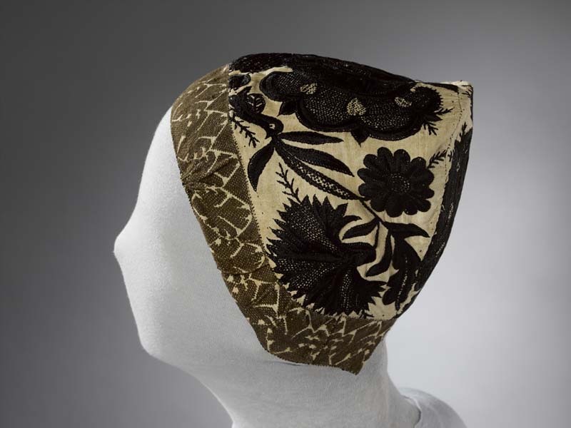 Huismuts of ondermuts van wit linnen, geborduurd met zwart garen, bloem en vogelmotieven, langs de rand zwart langet