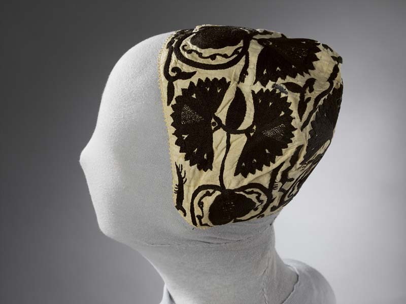 Huismuts of ondermuts van wit linnen, geborduurd met zwart garen, bloemmotieven, langs de rand wit bandje met muizentandjes