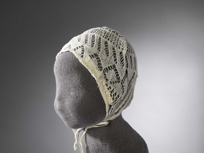 Muts ajour gebreid met witte katoen met spinnetjes-, zigzag- en streeppatroon