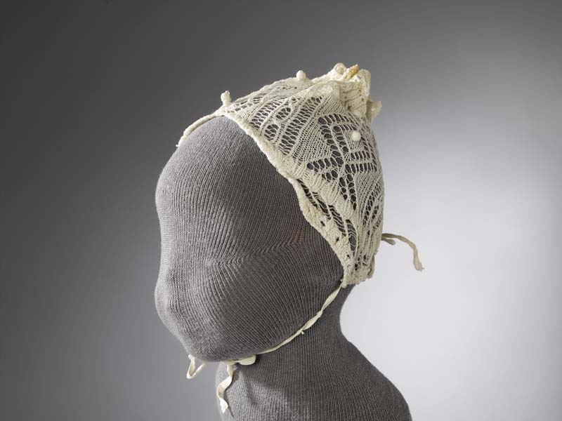 Muts ajour gebreid van wit katoen met verticale randen, o.a. ruitpatroon