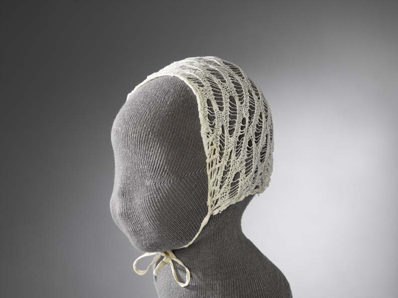 Muts, zeer open gebreid van witte katoen met diagonaal gaten patroon