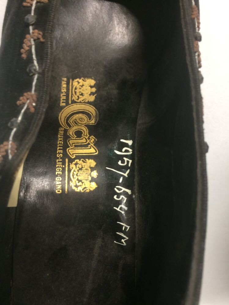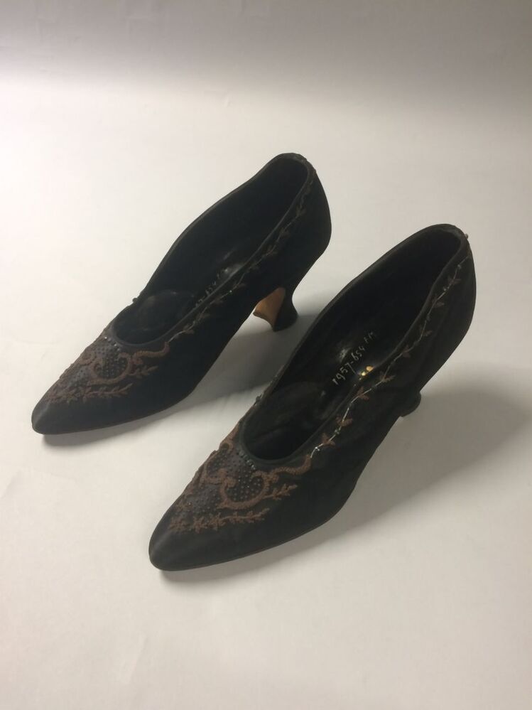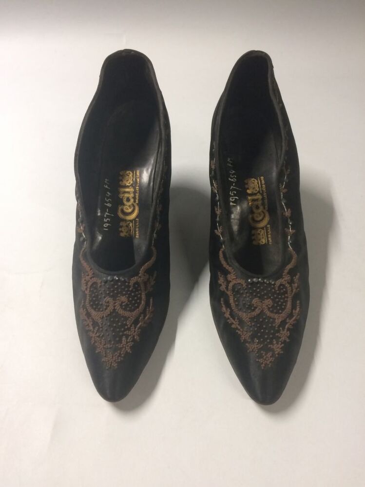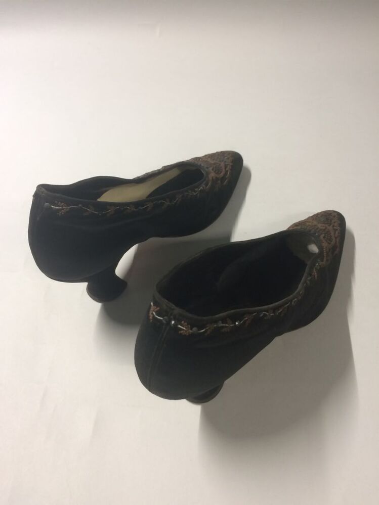 Paar zwart satijnen damesschoenen met hoge Queen-Anne hak, op de snuiten en langs de bovenrand bloemversiering uitgevoerd in ijzeren kraaltjesborduurwerk