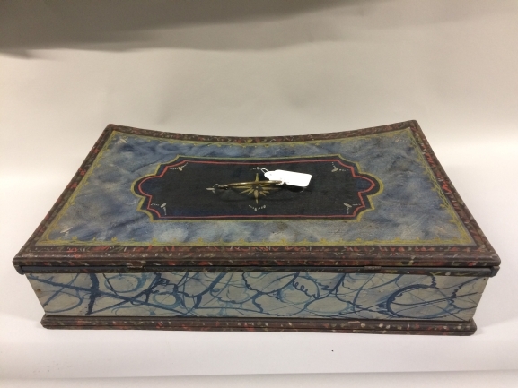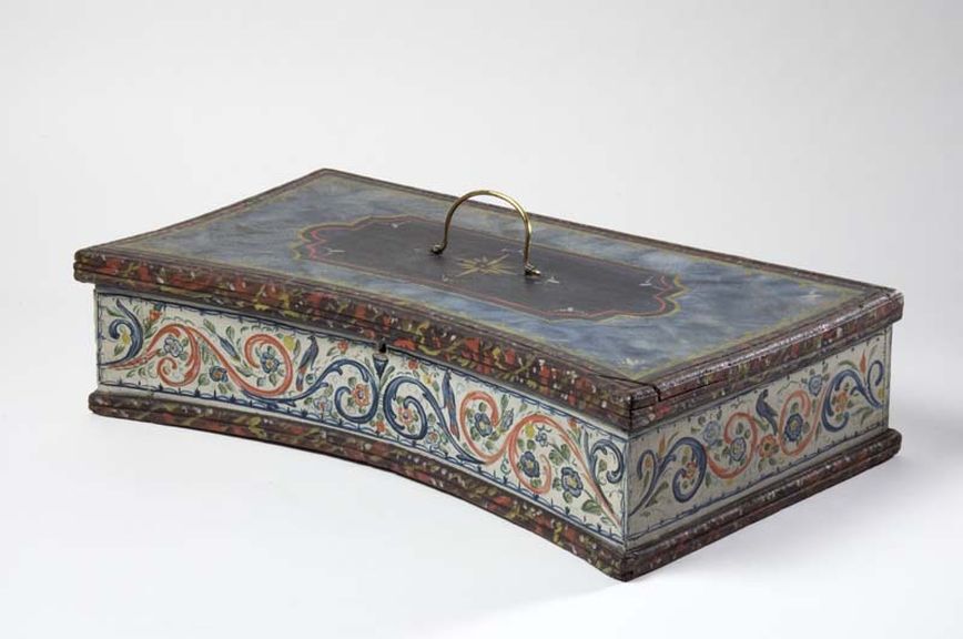 Beschilderde doos voor sondoeken, de bovenzijde blaw beschilderd, de zijden van de doos zijn beschilderd met een rankenmotief en vogels tegen een witte achtergrond