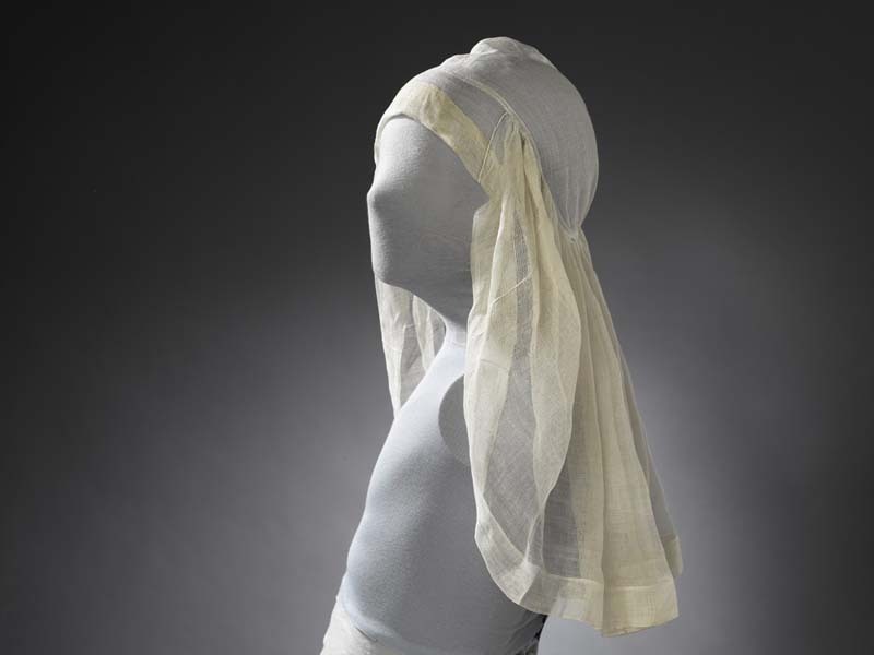 Sluiermuts, lange rouwfloddermuts van 'vierkante tule', slingerdraadgaas