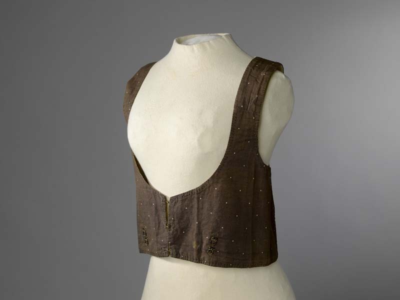 Empire onderjakje van donkerbruin katoen met uitgespaarde stippen, met ogen om rok aan te bevestigen