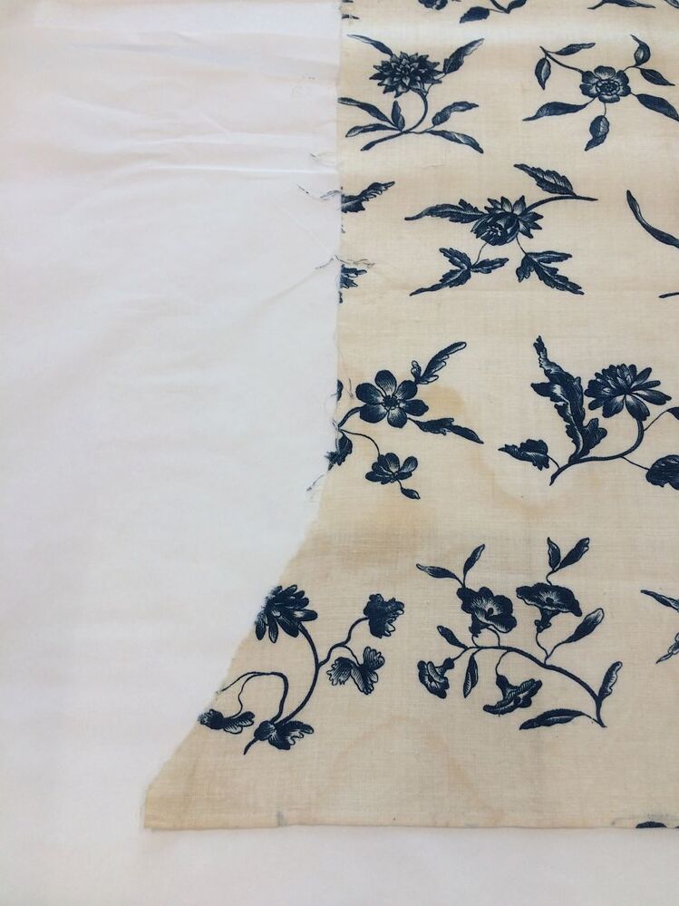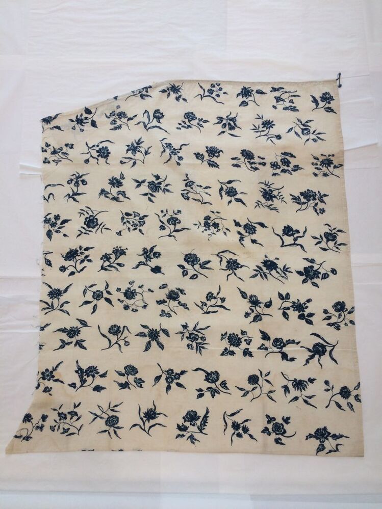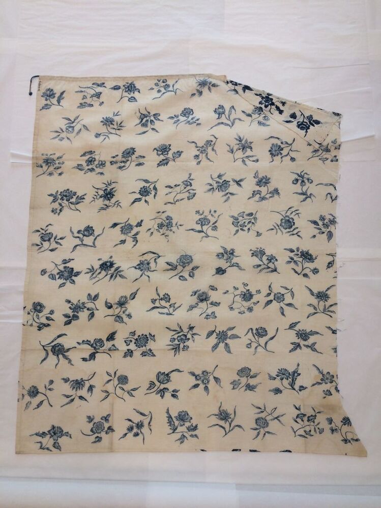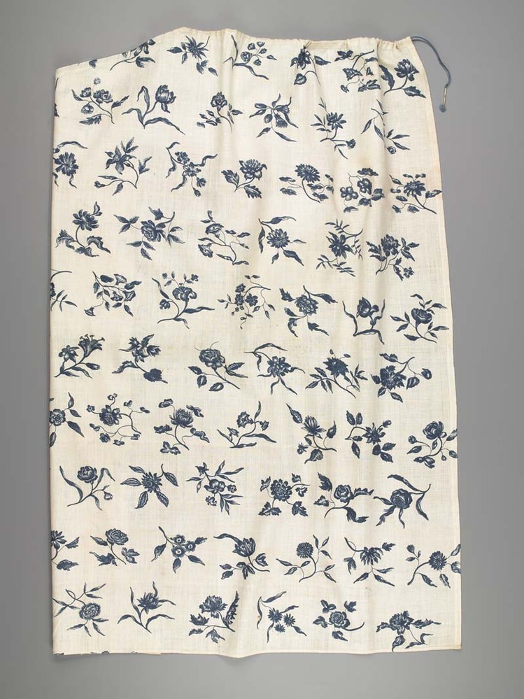 Helft van sitsen schort met allemaal verschillende blauwe bloemmotieven op witte grond