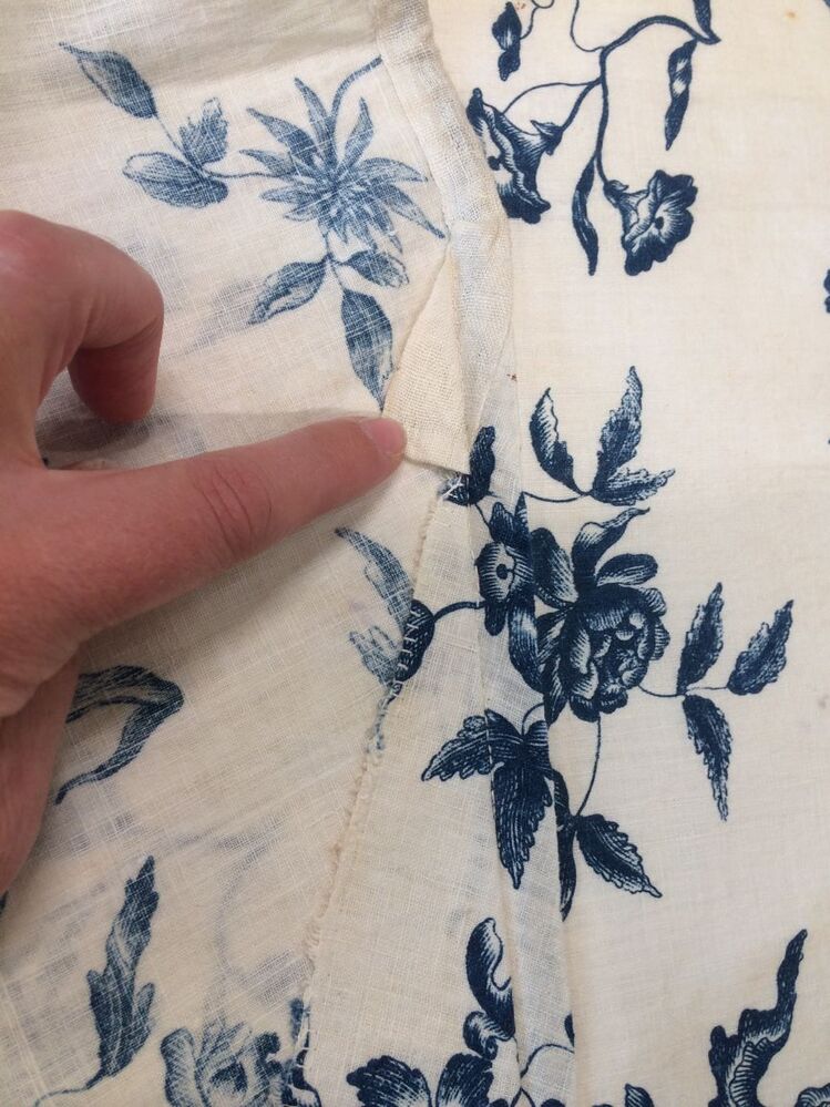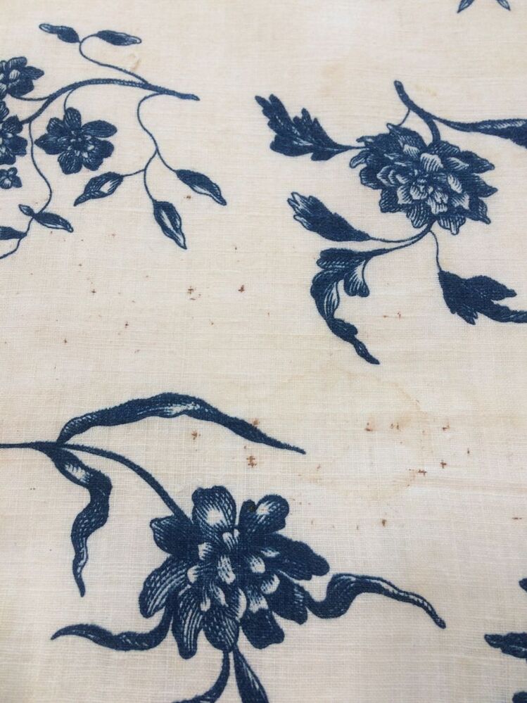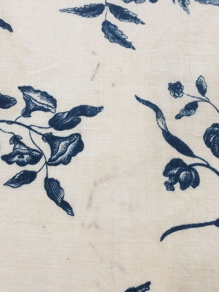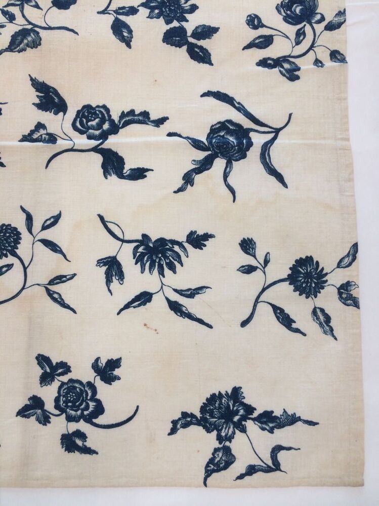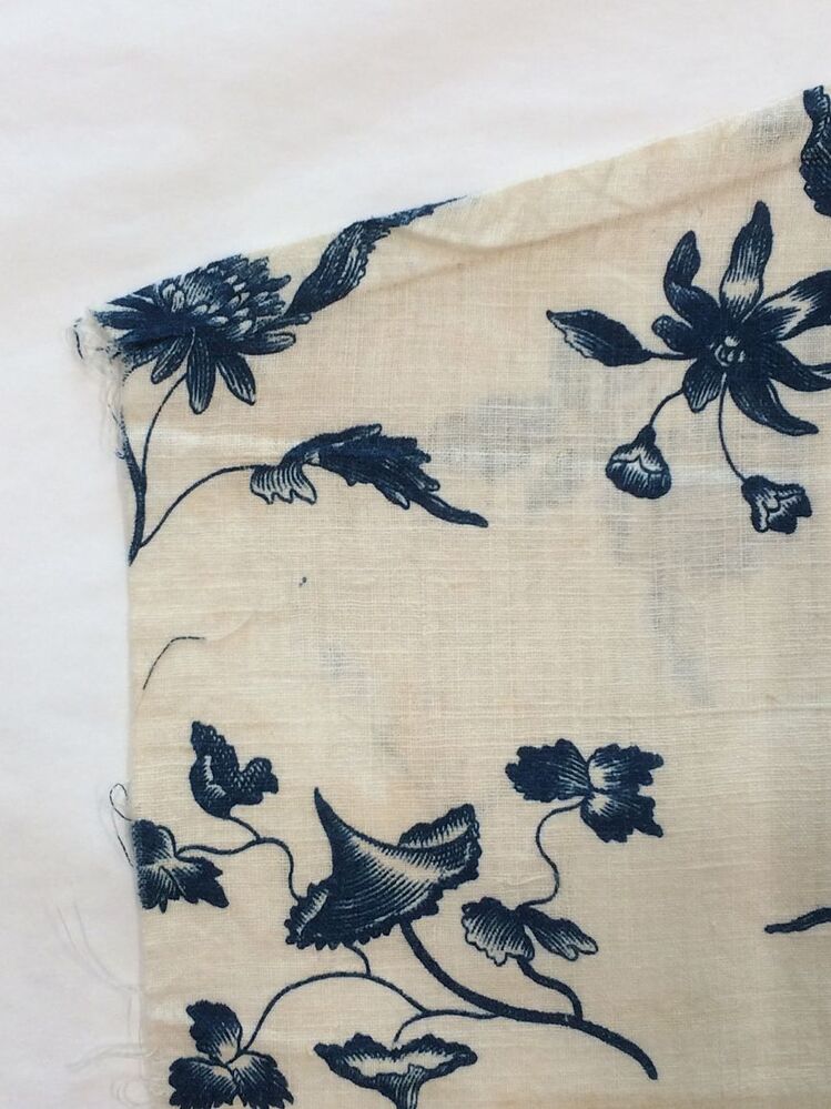 Helft van sitsen schort met allemaal verschillende blauwe bloemmotieven op witte grond