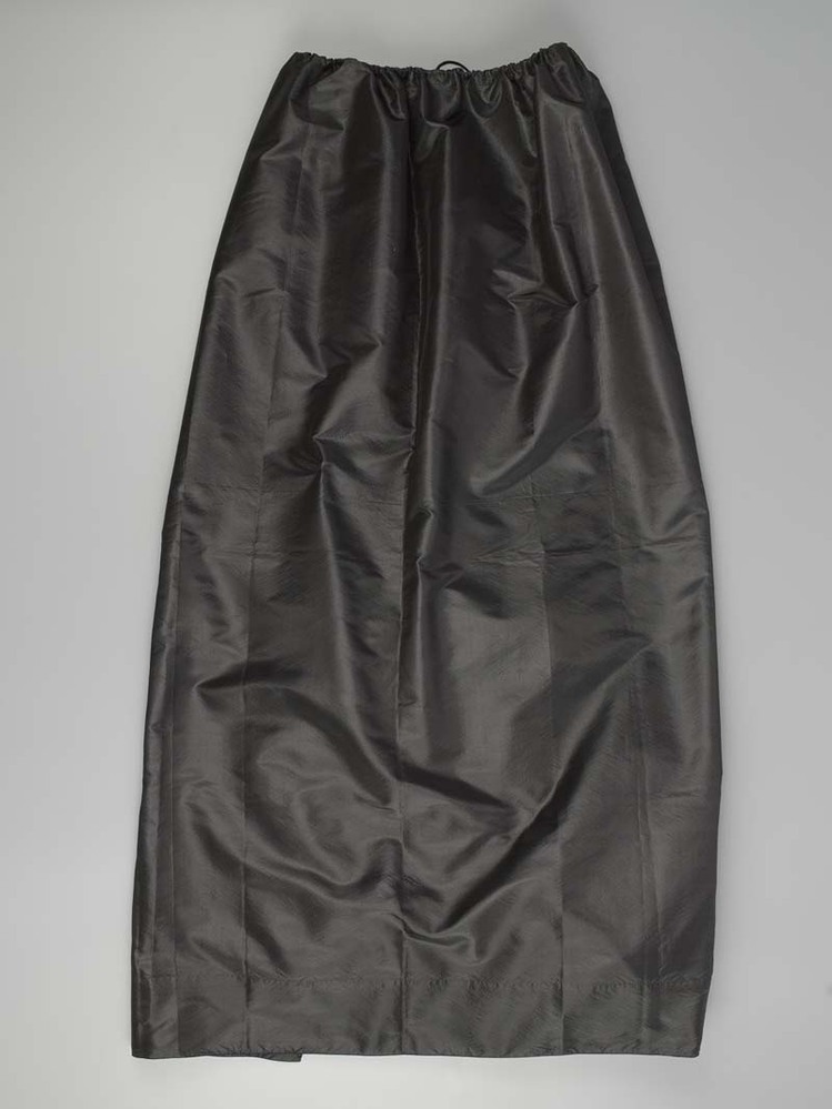 Een schort van zwarte taftzijde, langs de bovenrand een zwart koordje als trekband