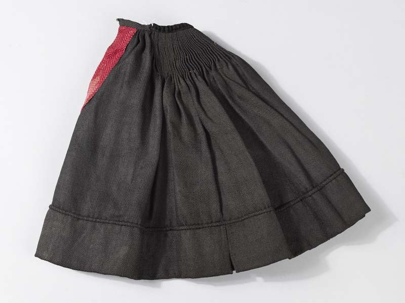 Zwarte Hindeloper poppenrok, sluiting is afgezet met zijden keperband