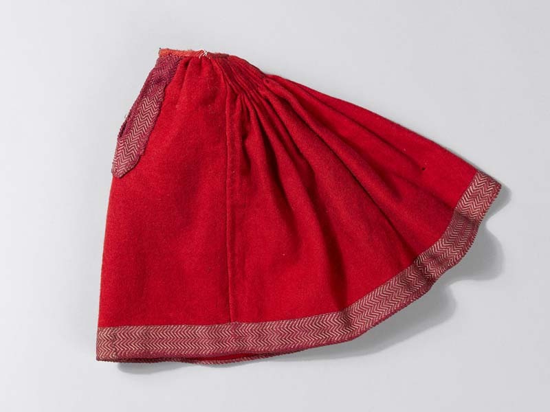 Rode wollen poppenonderrok afgezet met zijden keperband