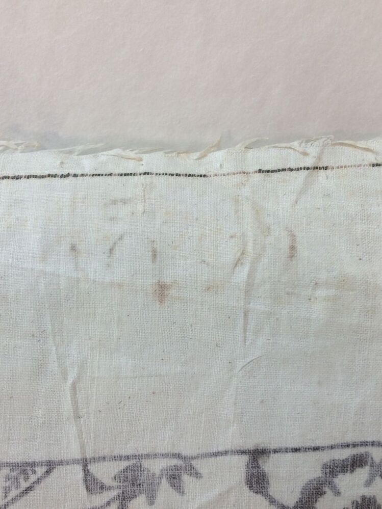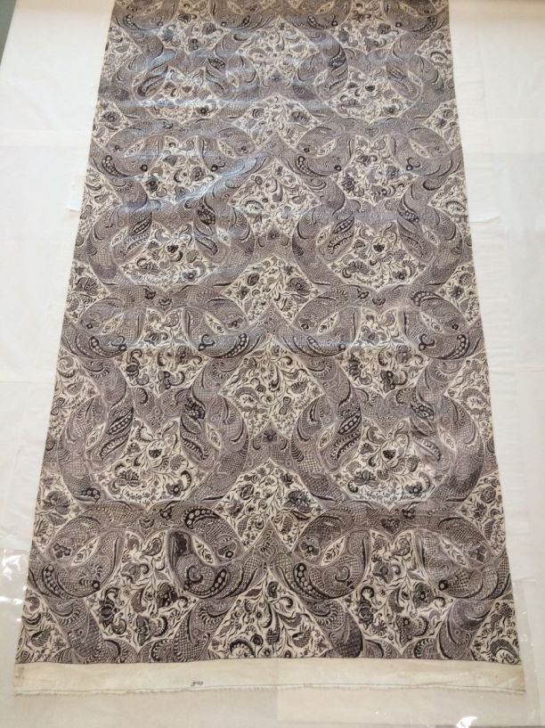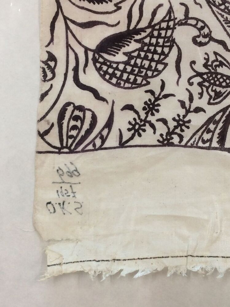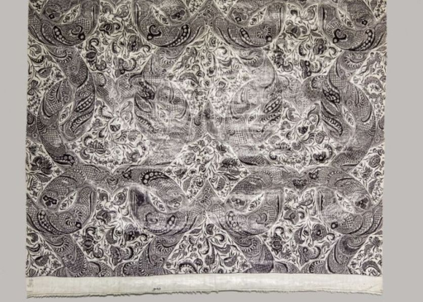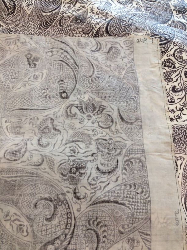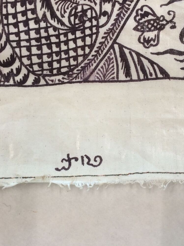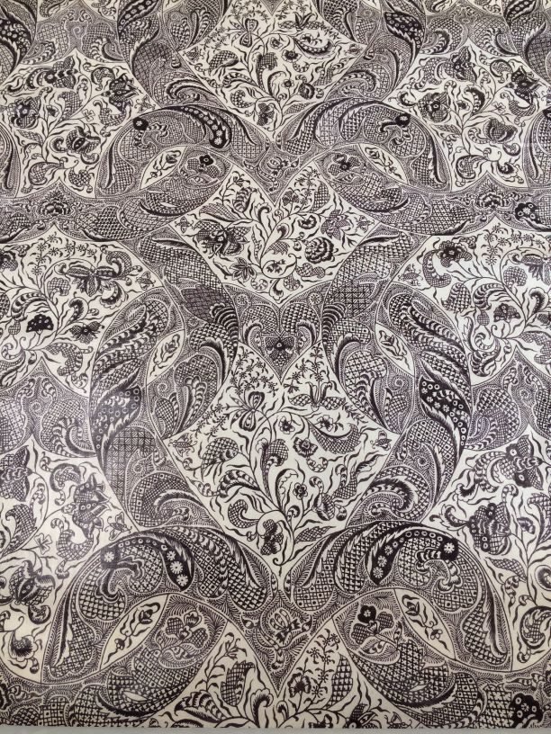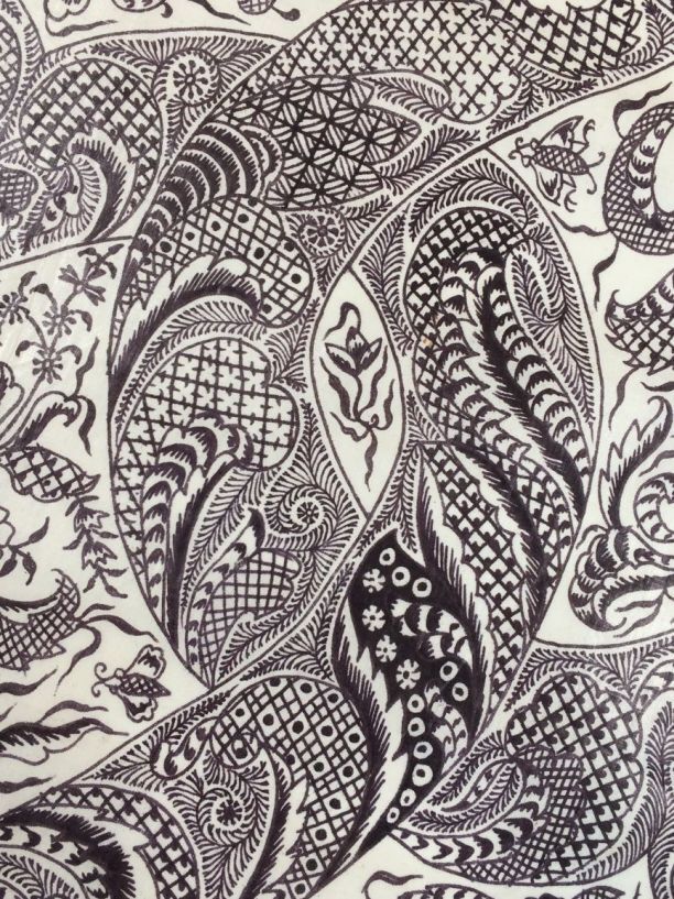 Complete lap beschilderde sits met doorlopend motief van in elkaar gehaakte lussen met bloemmotieven in zwart op witte grond