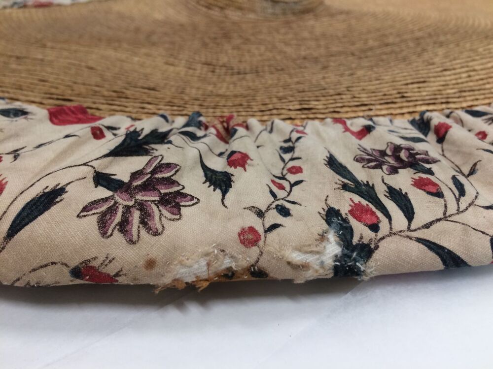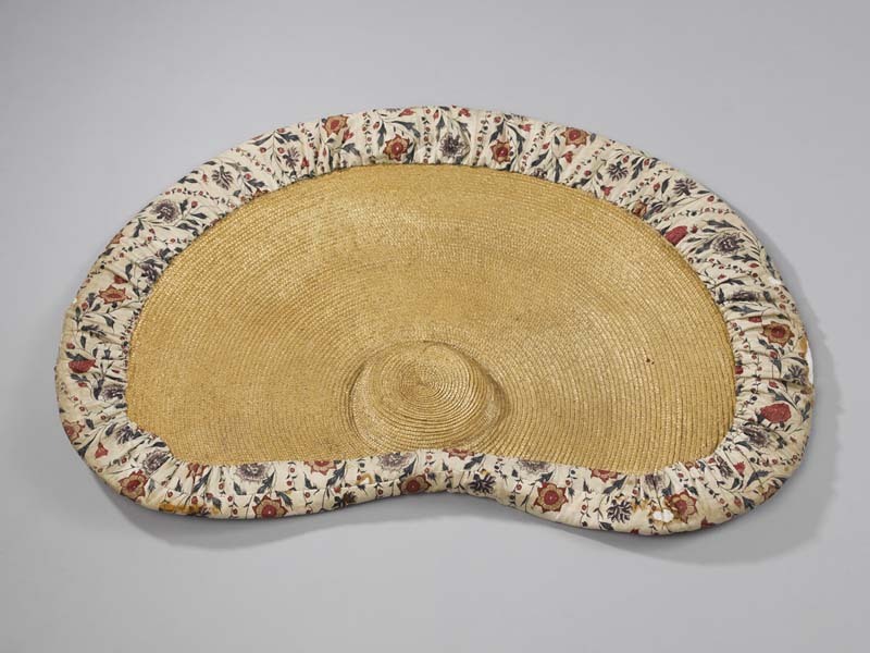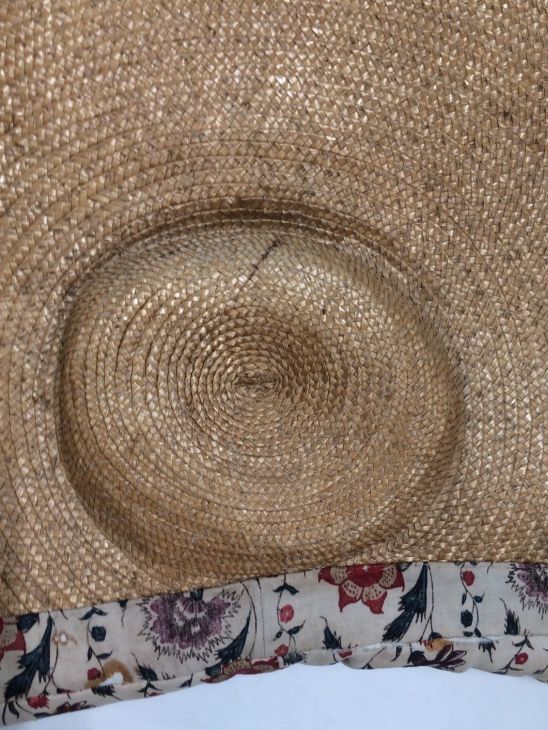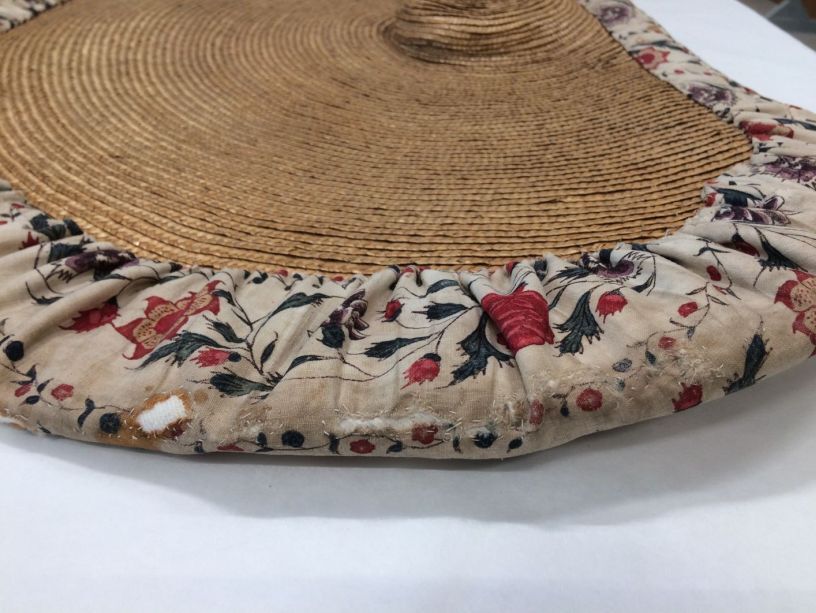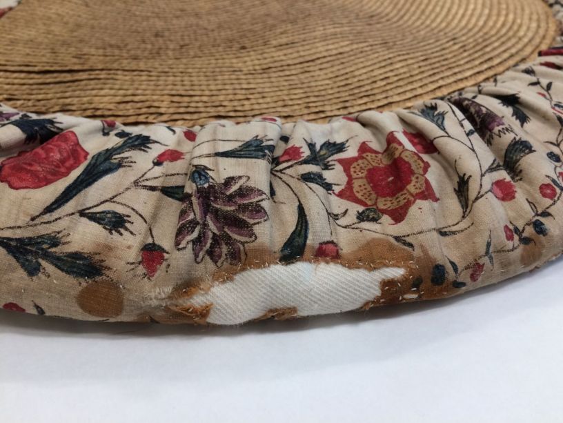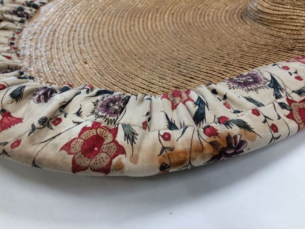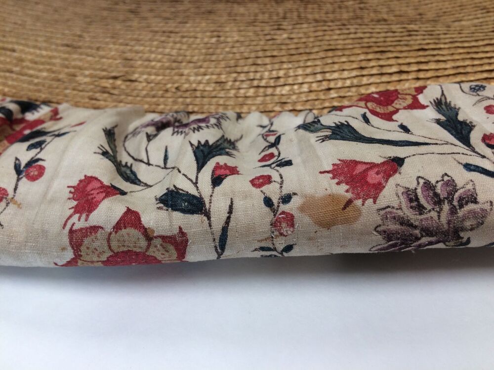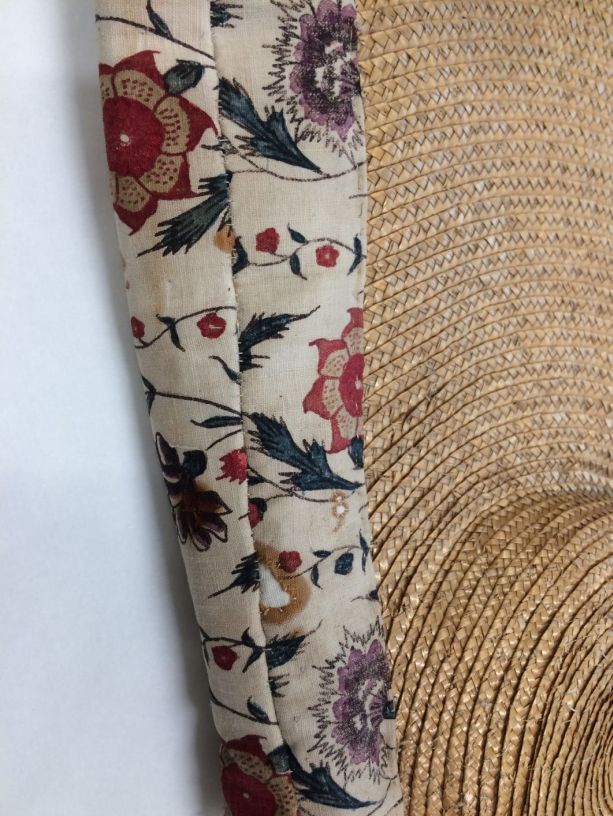 Zonhoed met sitsen voering, geschilderd in streeppatroon van smalle en bredere bloemranken op witte grond