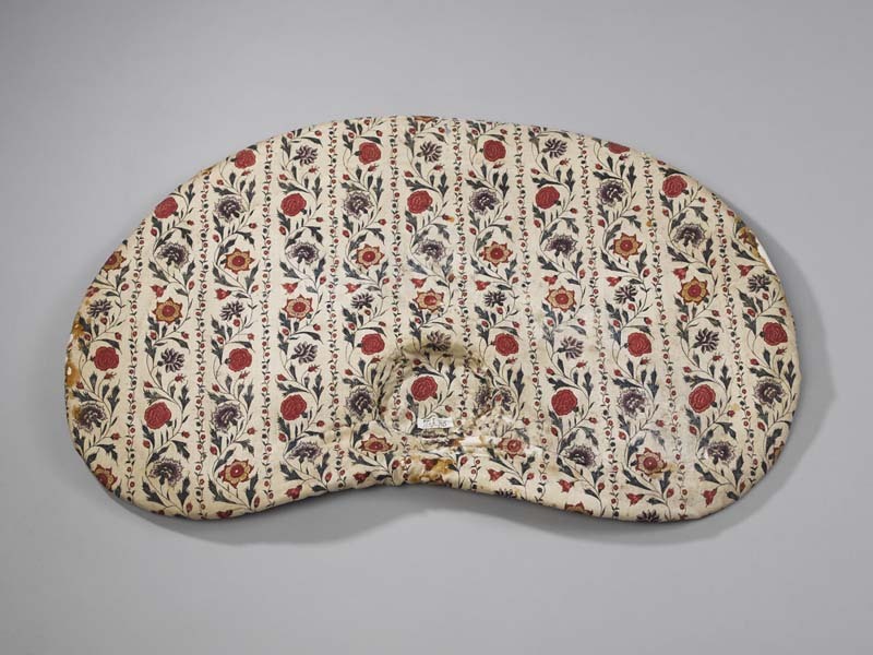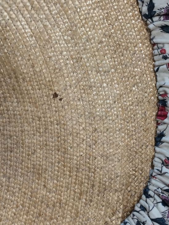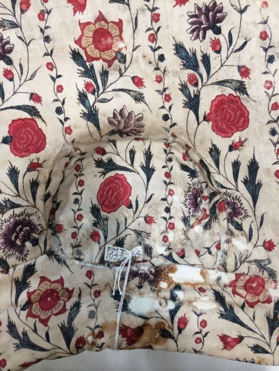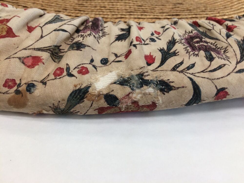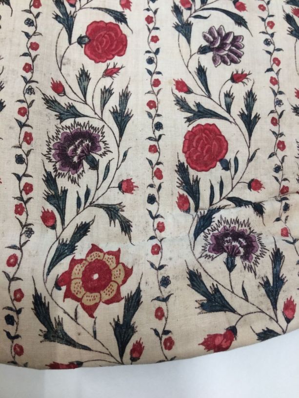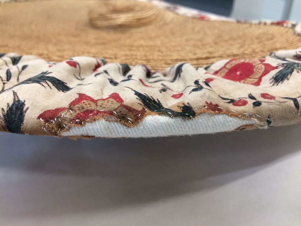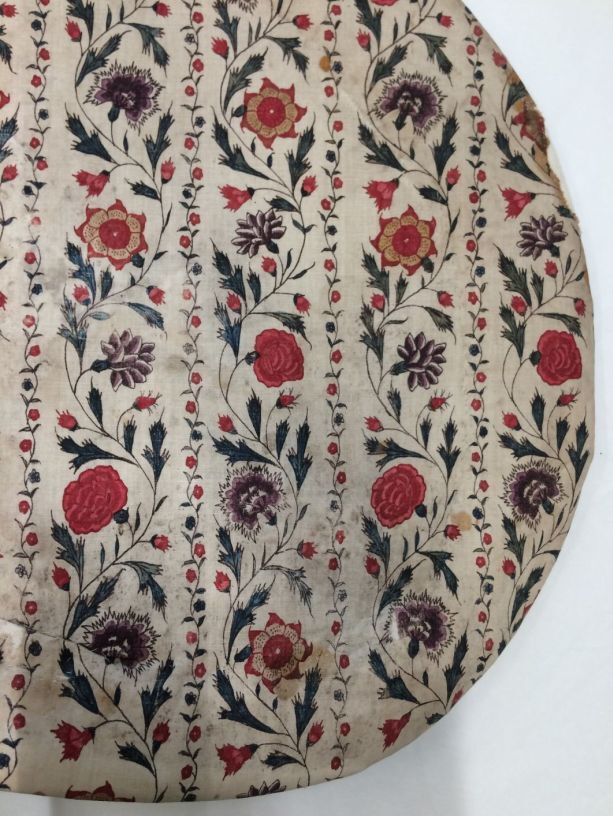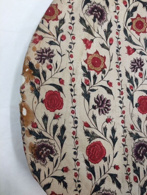 Zonhoed met sitsen voering, geschilderd in streeppatroon van smalle en bredere bloemranken op witte grond