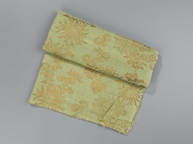 Lap van lichtgroene stof van een los weefsel, bedrukt met bloemmotieven in goudblad