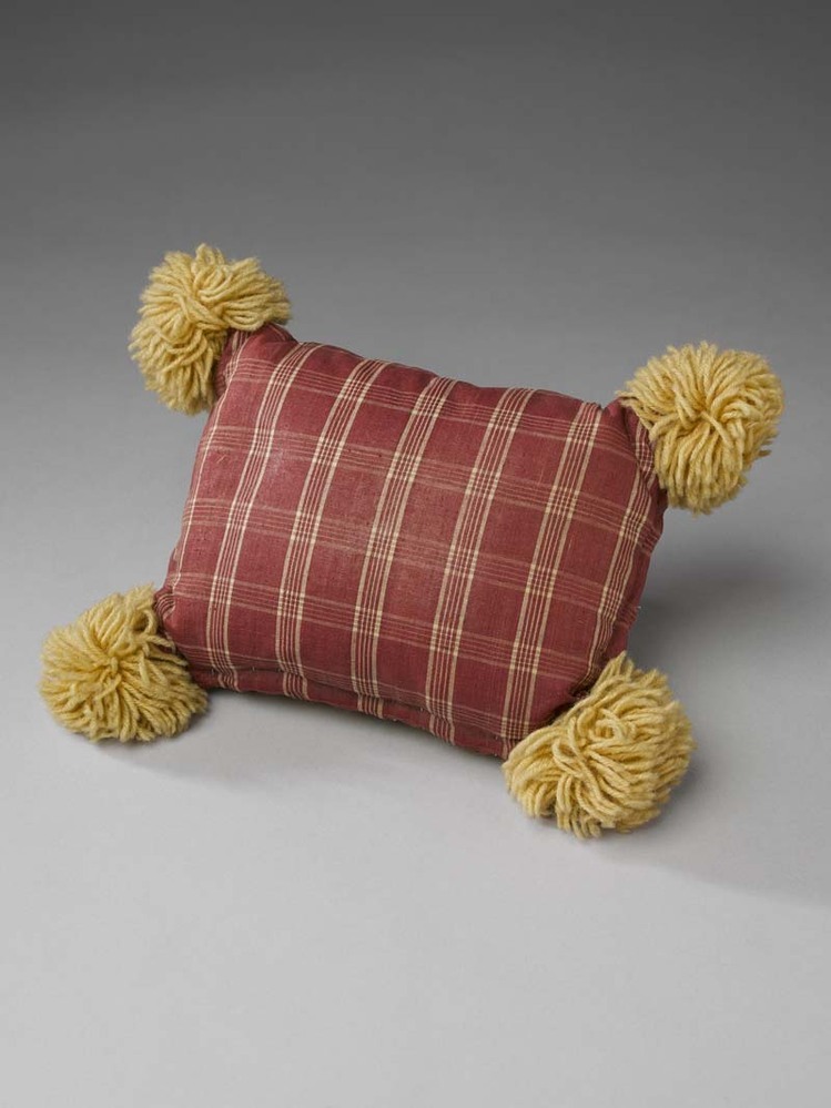 Hindelooper kussenvoor op poppenwieg, op de hoeken geel wollen pomponnen