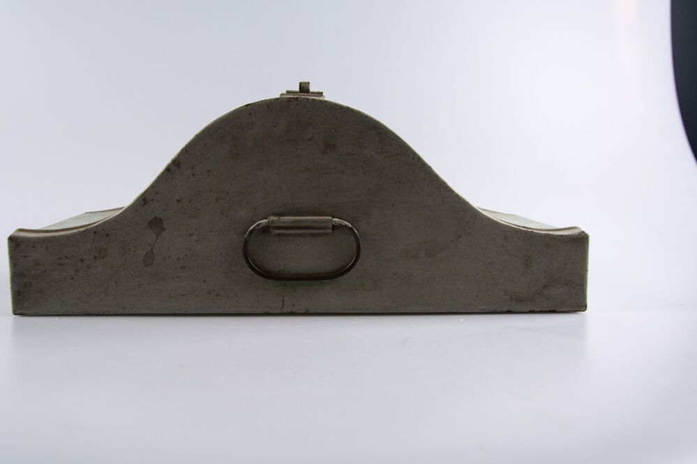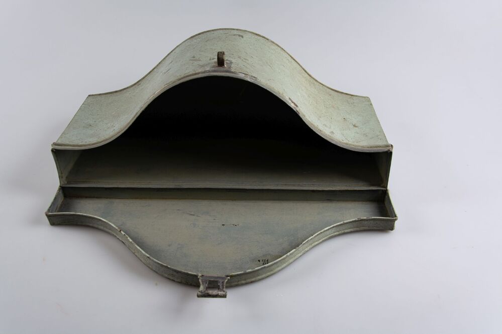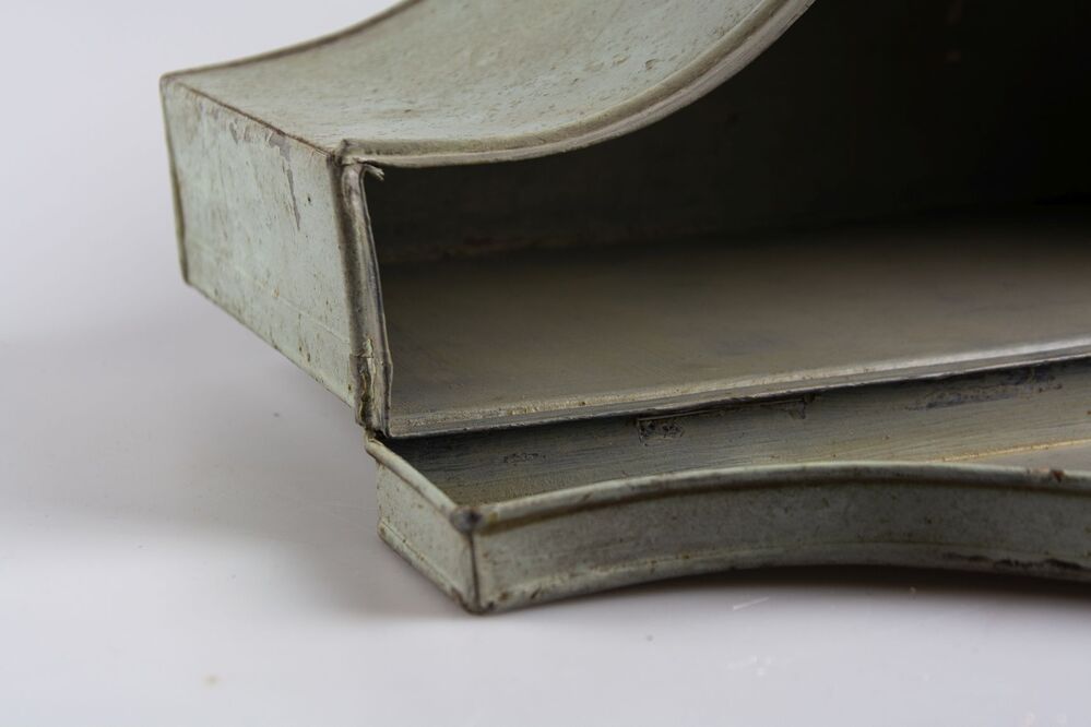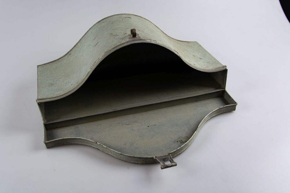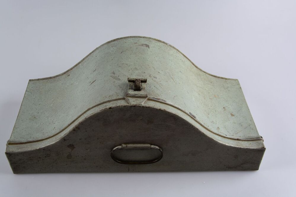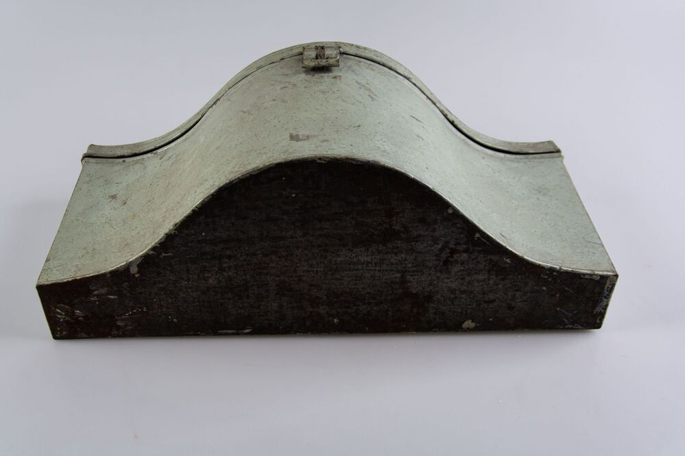 Blikken doos voor bicorne met oranje cocarde en knoop waarop kroontje met kronkel