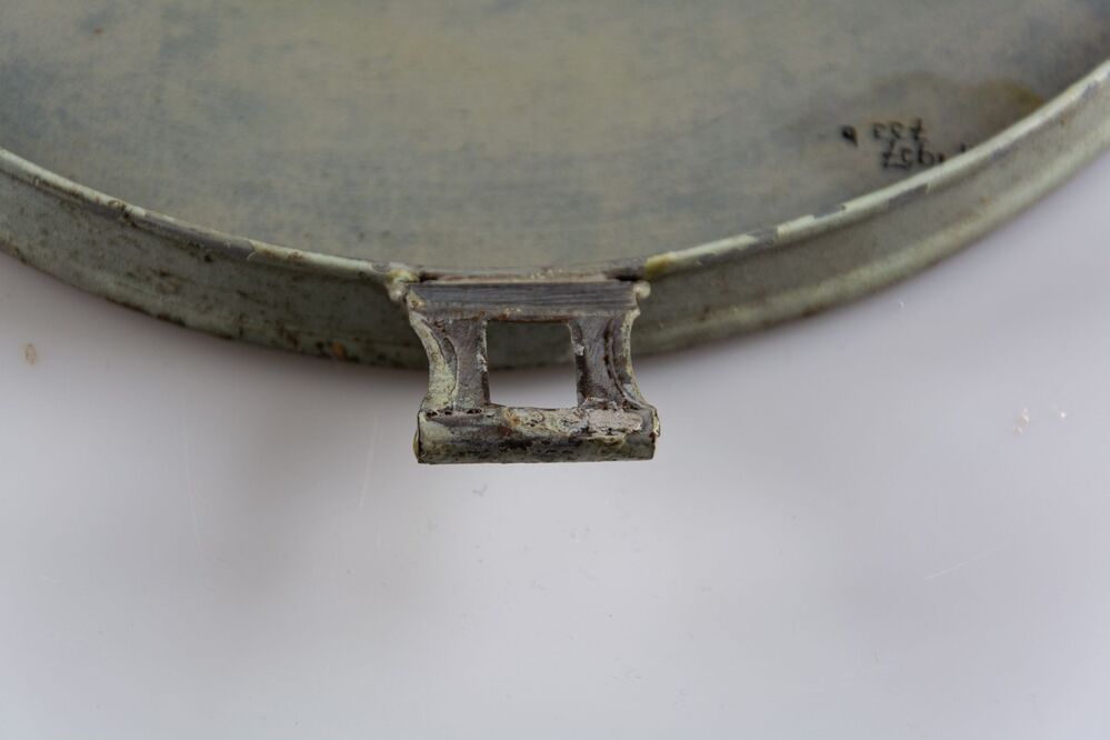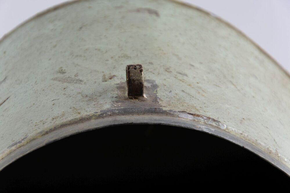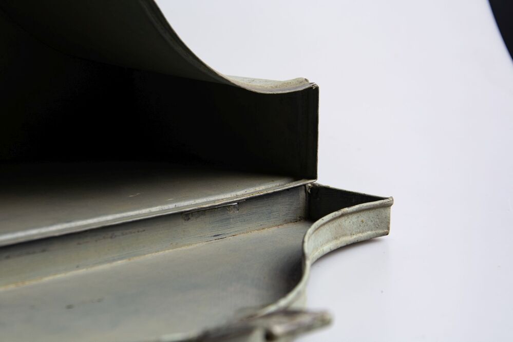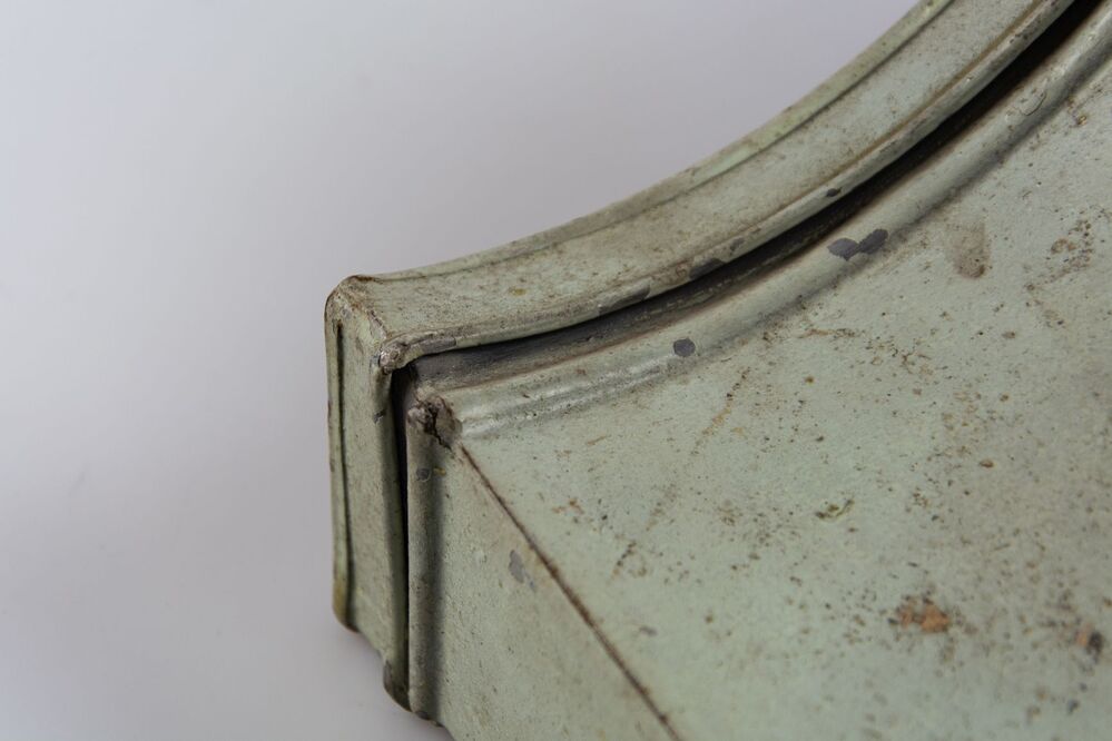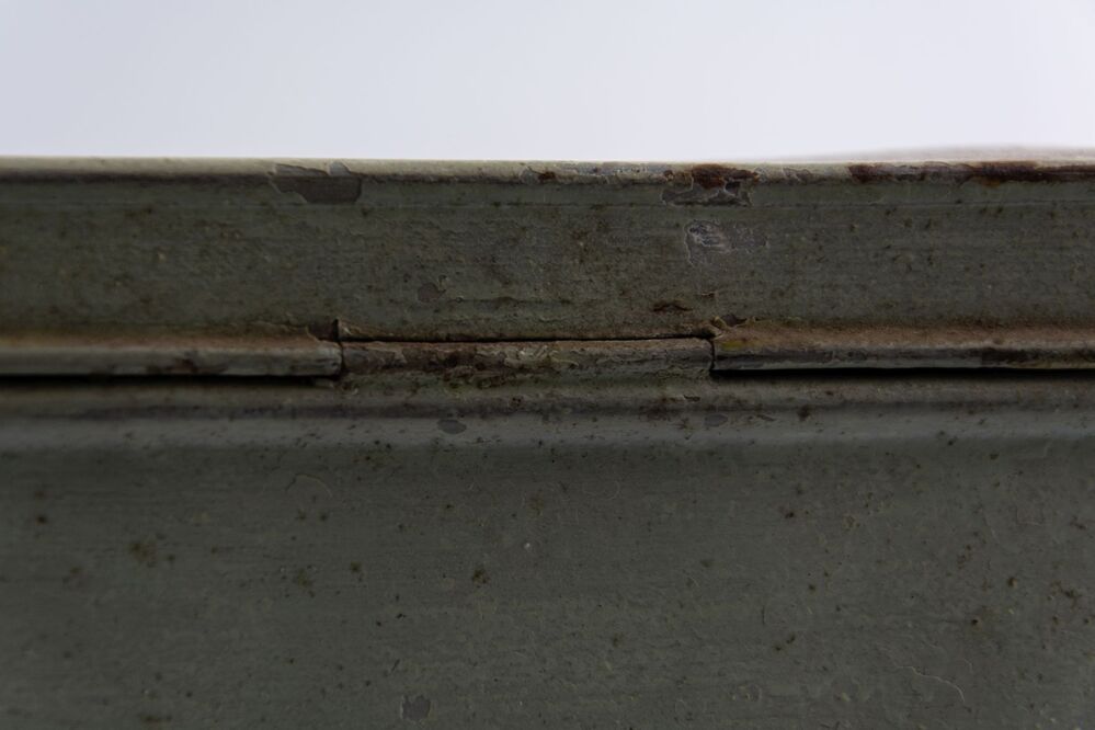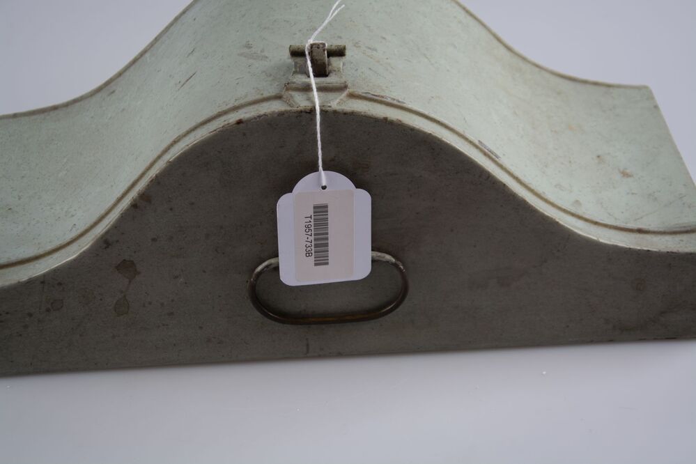Blikken doos voor bicorne met oranje cocarde en knoop waarop kroontje met kronkel