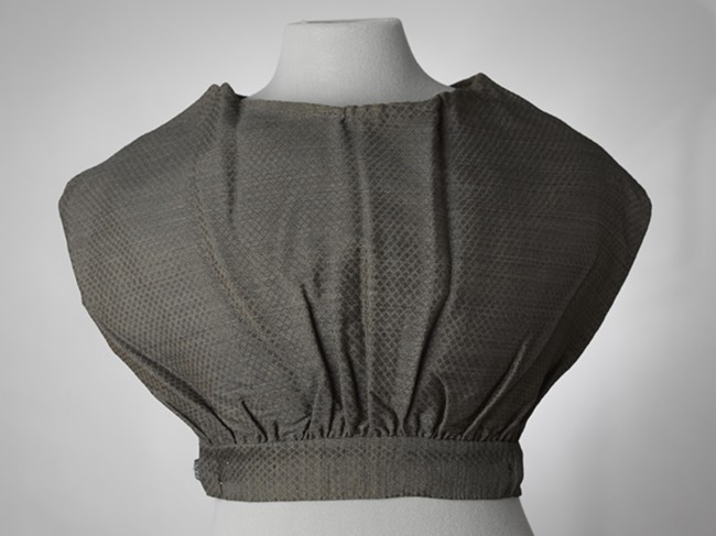 Kroplap van zwarte zijdeachtige stof, waarin motiefje is verwerkt, gevoerd met blauwe katoenen stof