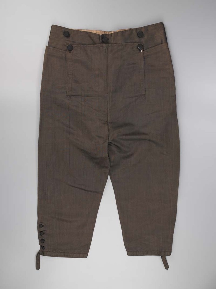 Grijs-bruine kniebroek van satijn met klepsluiting