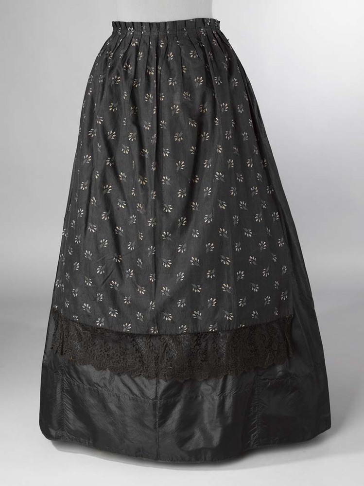 Schortje van zwarte katoen met ingeweven zwarte bloemetjes, bedrukt met paars-witte bloemboeketjes