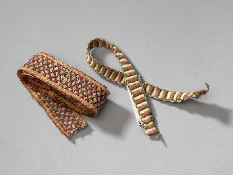 Twee bandjes van lokkesnoorlint, een smal bandje met smalle streepjes in rood, wit, groen en geel, en een breder bandje in dezelfde kleuren
