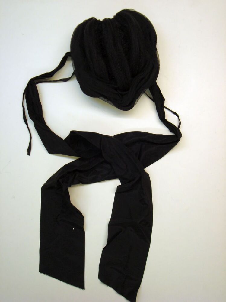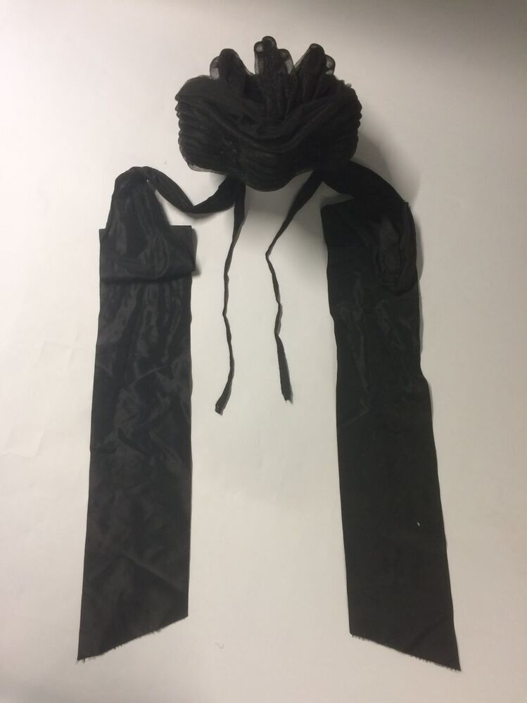 Zwarte dameshoed van gevlochtenband met tule, lint en satijnen bloemen