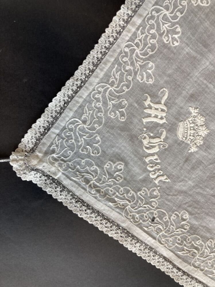 Zakdoek van wit batistkatoen, hoekmotief in frans borduurwerk een kroon en M. Hesse, Martje Hesse