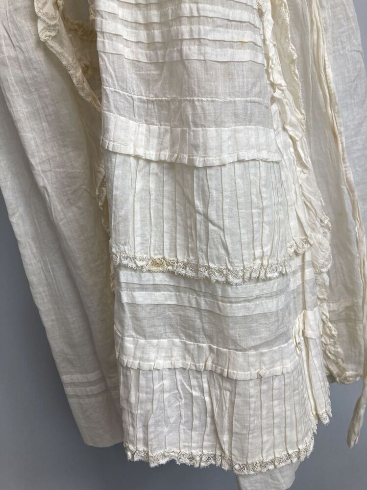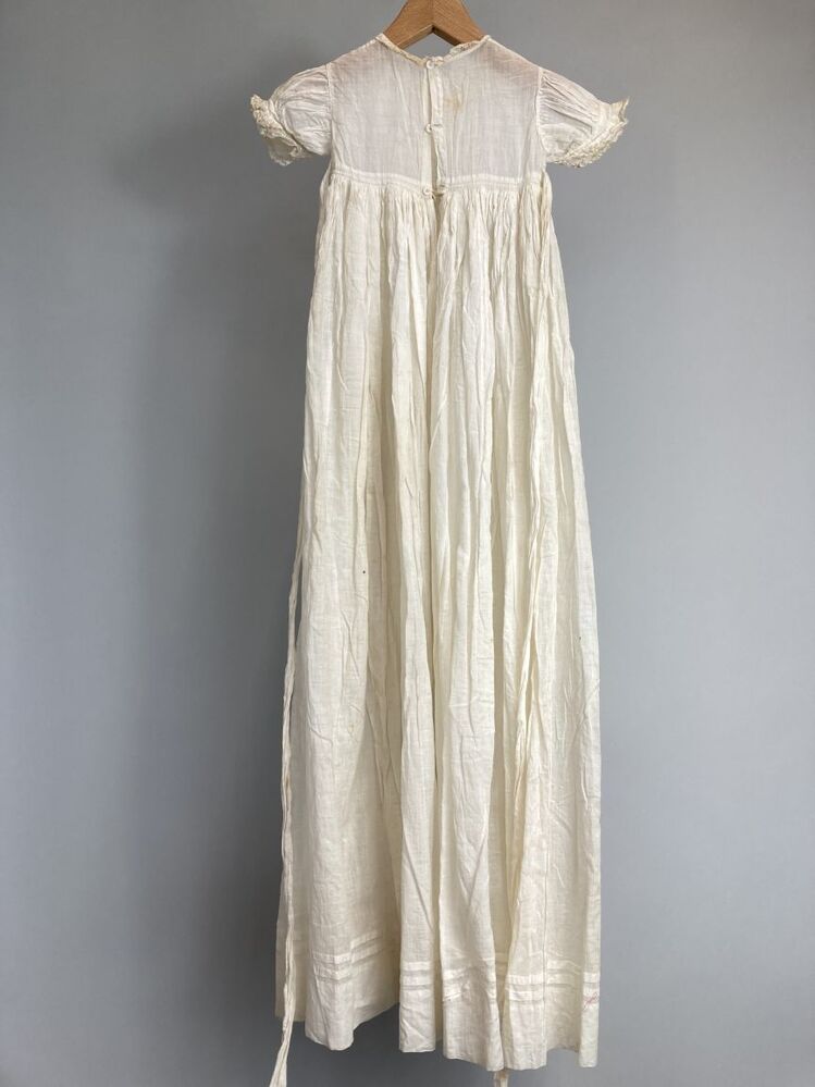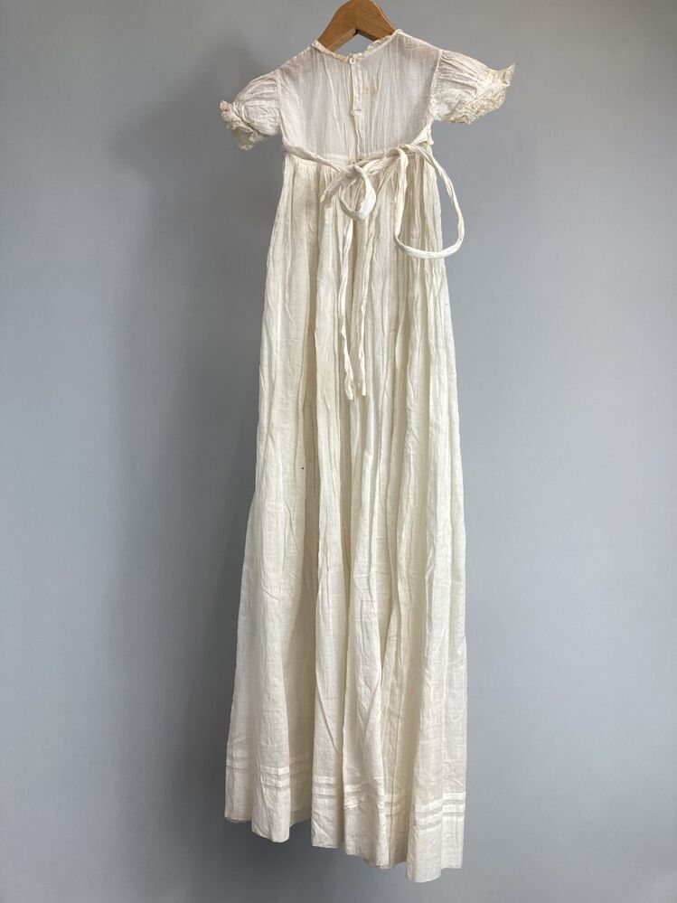 Doopjurk van wit transparant batist met naaldplooitjes , machinaal kant en wit borduursel