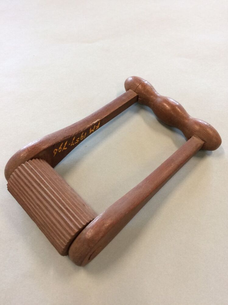 Ronde rol met ribbellijn, onderdeel van mutsenpijpraam voor het plooien van oorijzermutsen, met diverse andere voorwerpen
