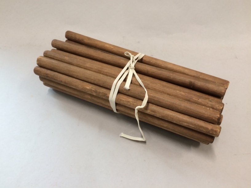 28 Mutsenpijpstokjes, onderdeel van mutsenpijpraam voor het plooien van oorijzermutsen, met diverse andere voorwerpen