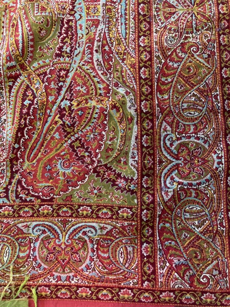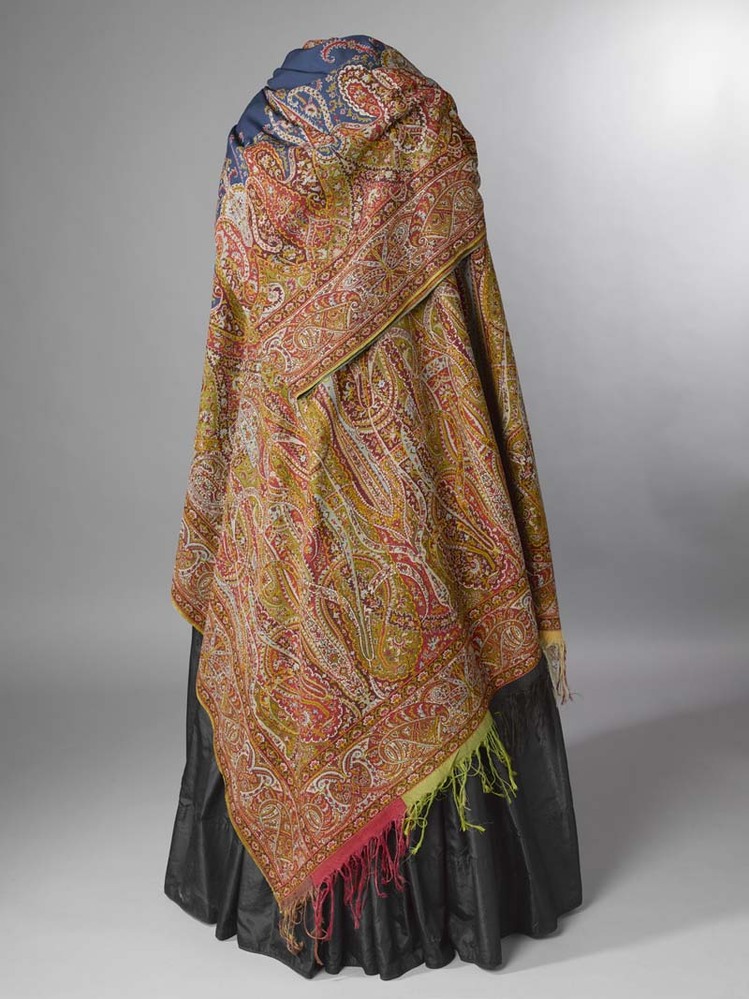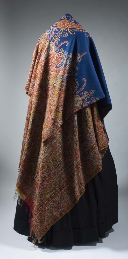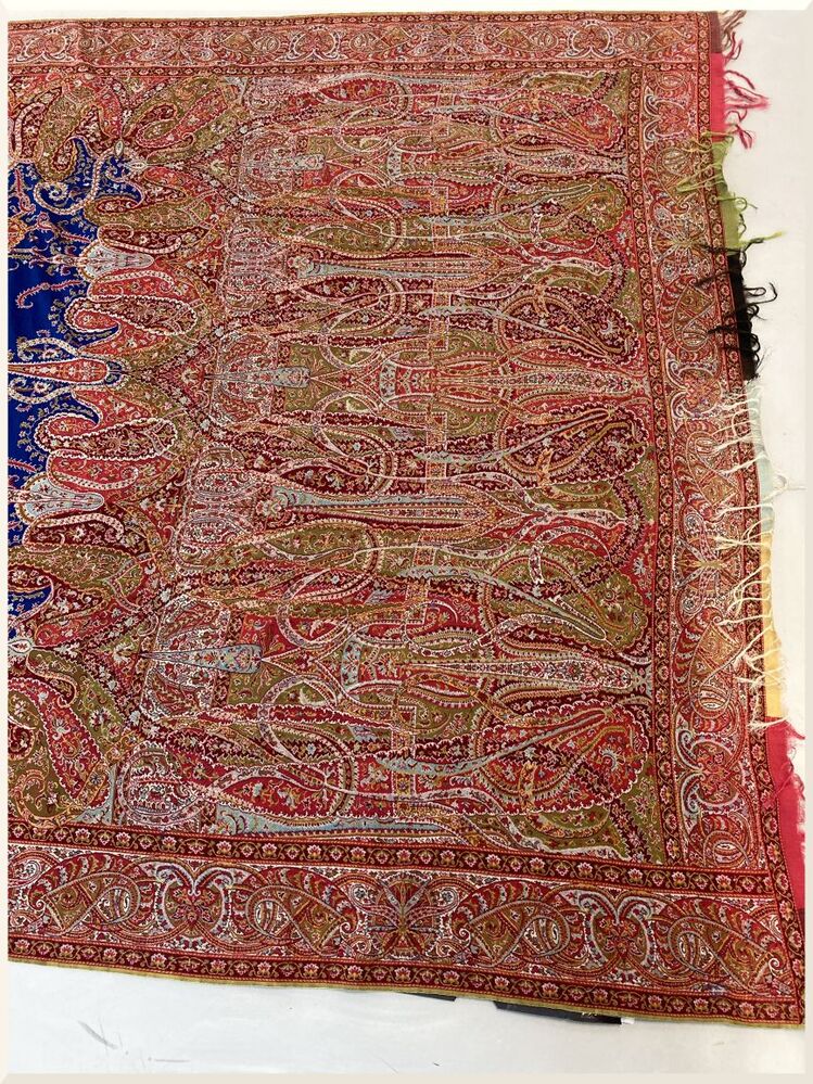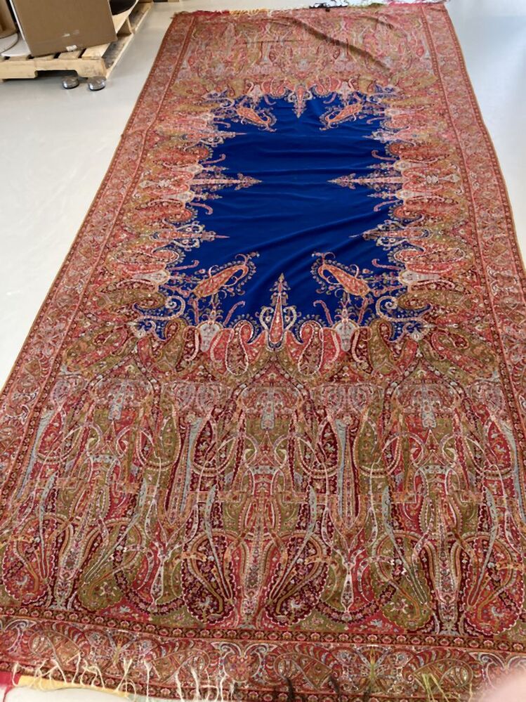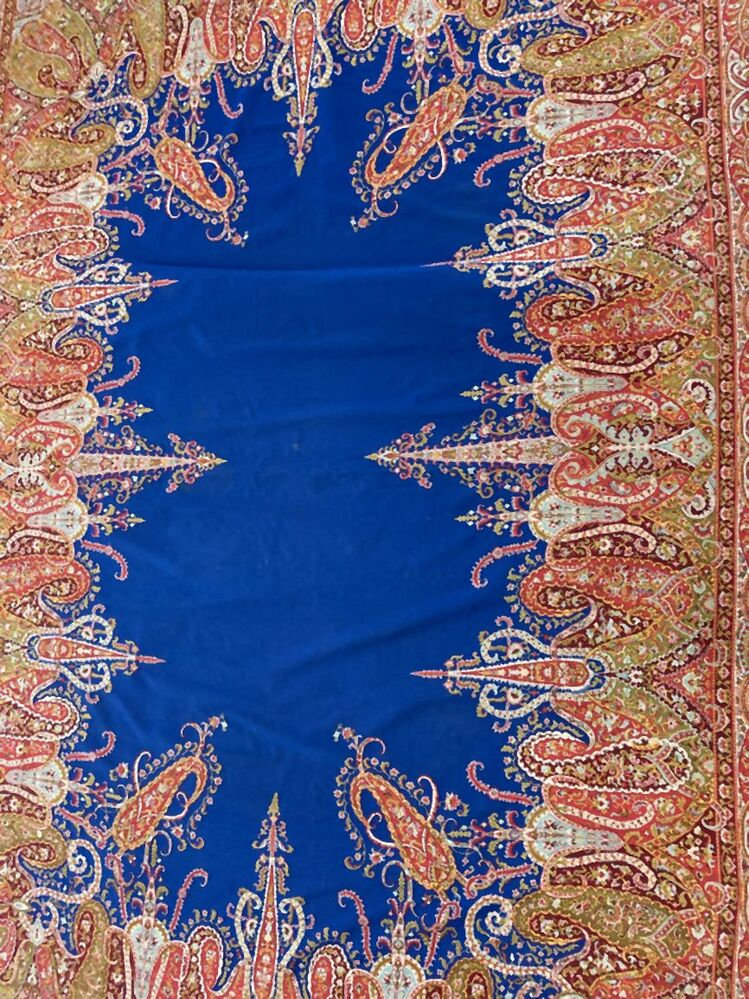 Slingerdoek van gekleurde wol met ingeweven kasjmierpatroon, blauw middenveld