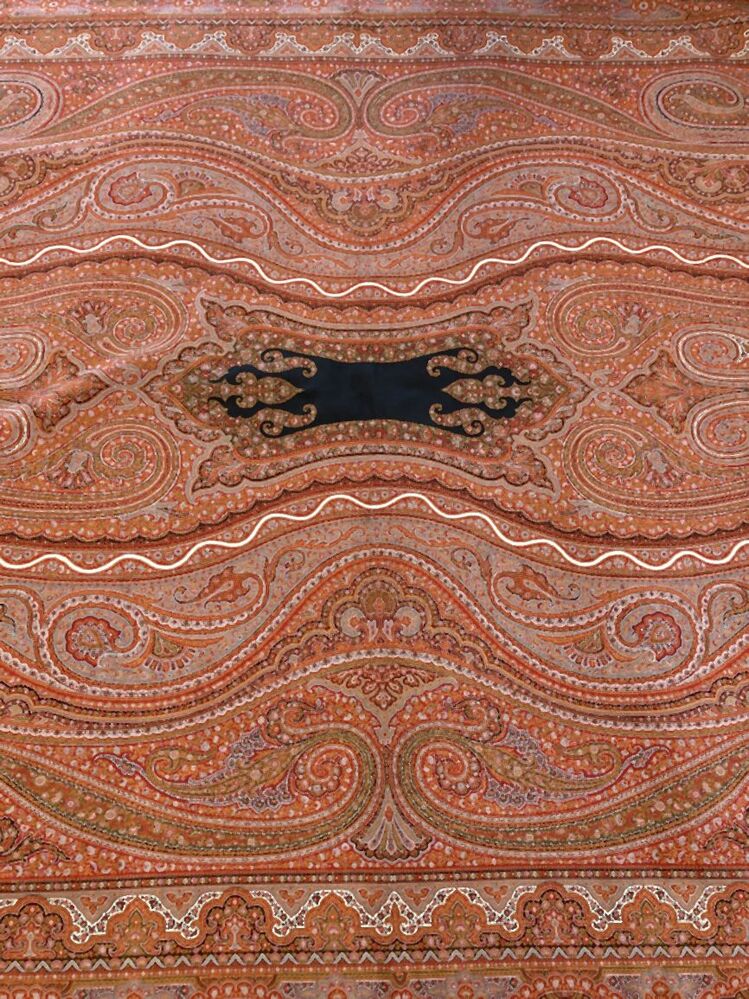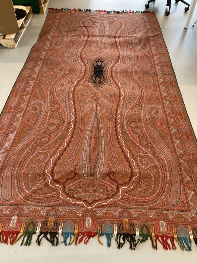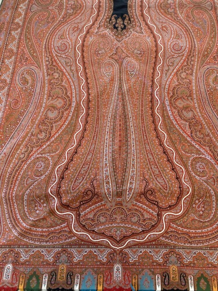 Kasmiersjaal, omslagdoek van gekleurde wol, met ingeweven patroon van slingerfiguren