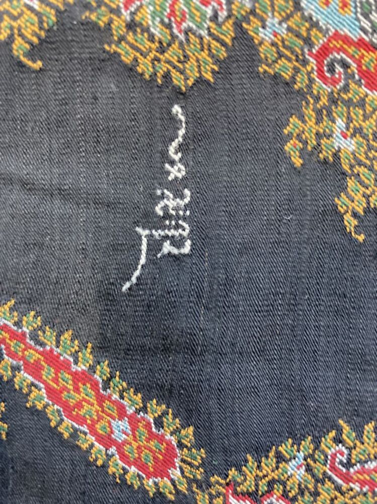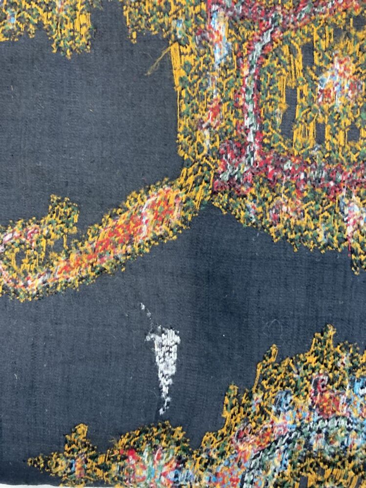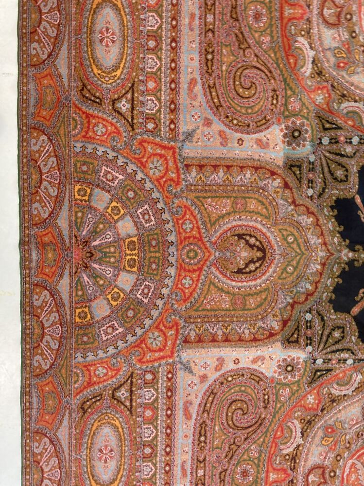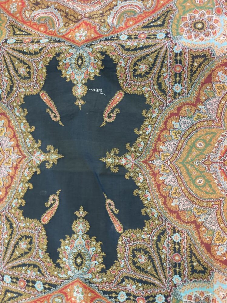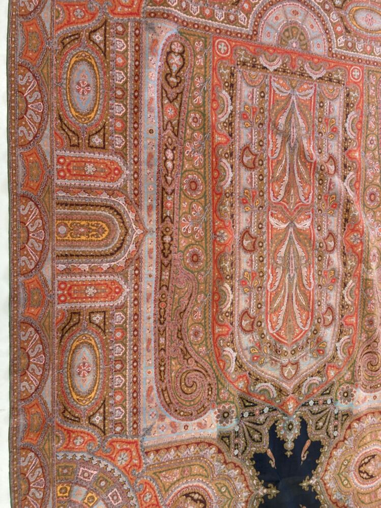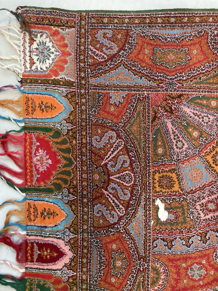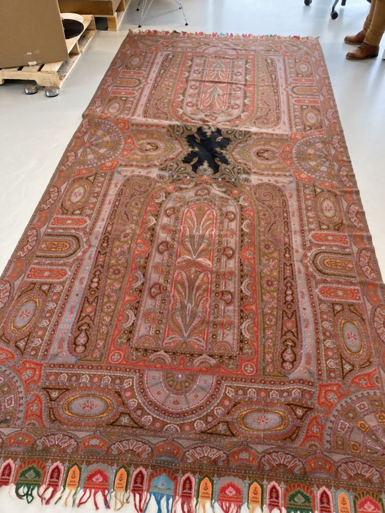 Slingerdoek van wol met ingeweven kashmirpatronen in in banen en twee rechthoekige vlakken