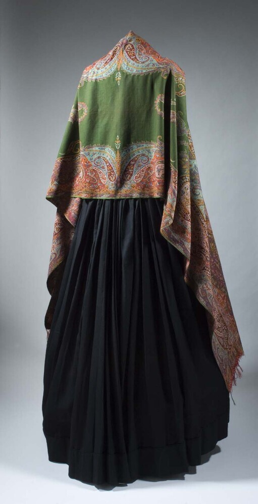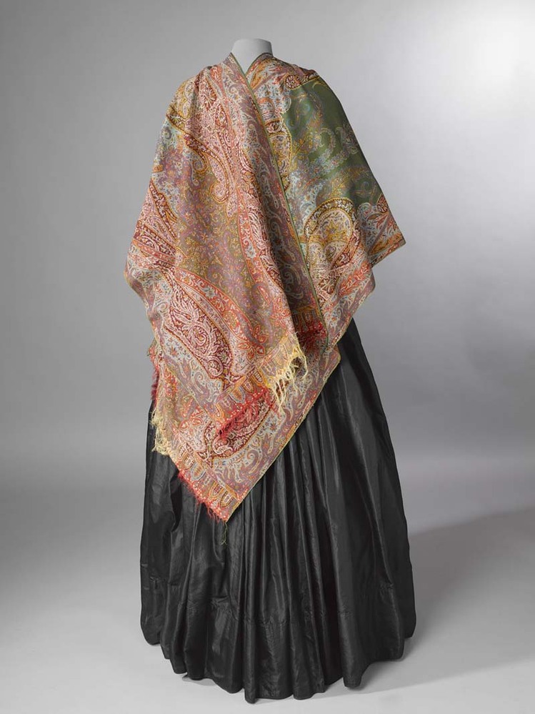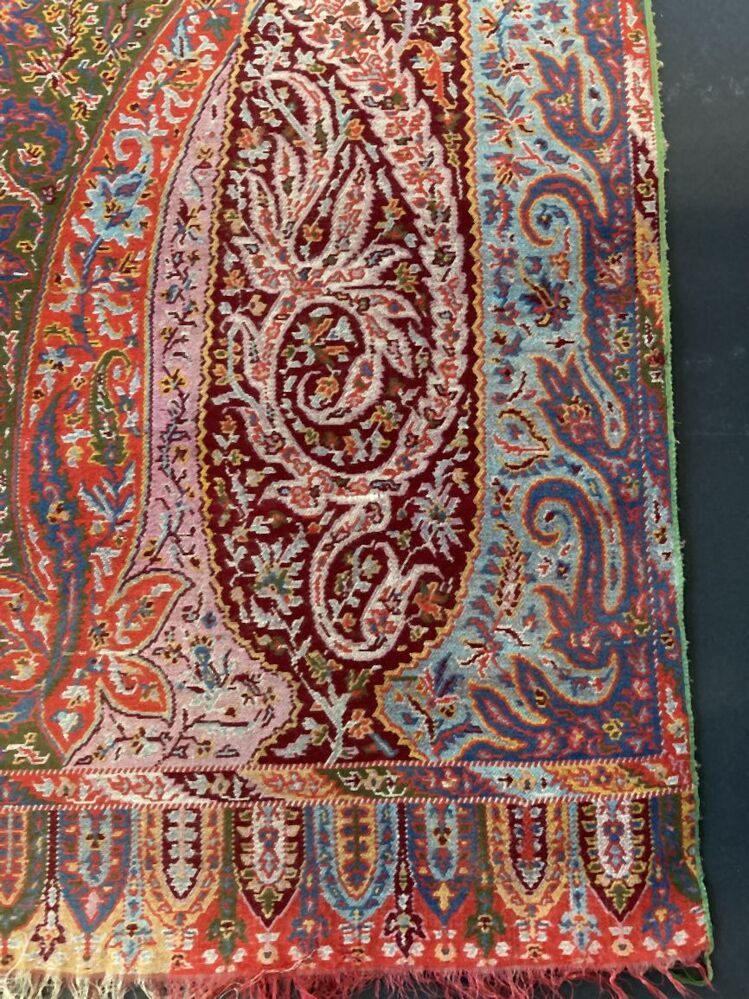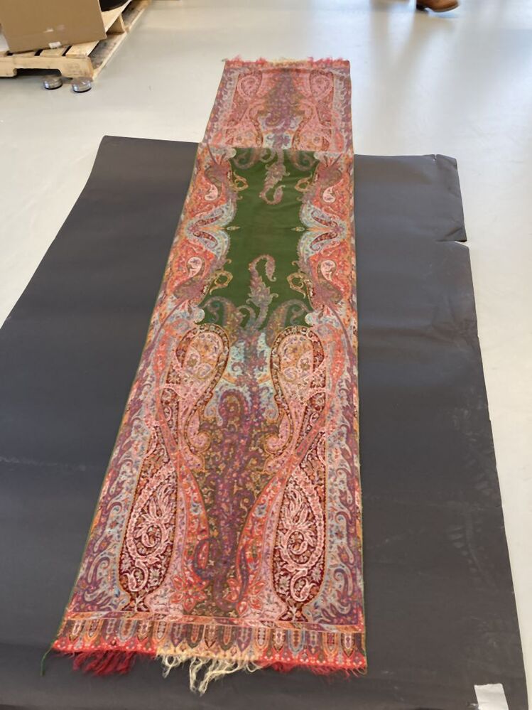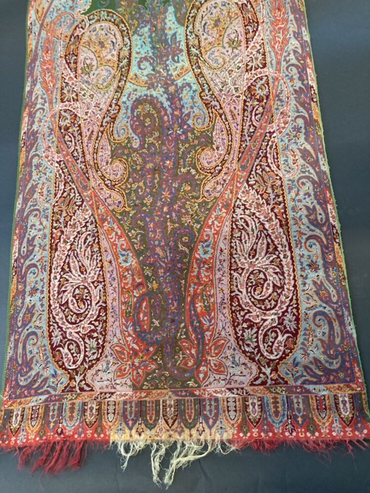 Smalle slingerdoek of sjaal van kleurrijke wol, ingeweven kasjmier randen, groen middenveld