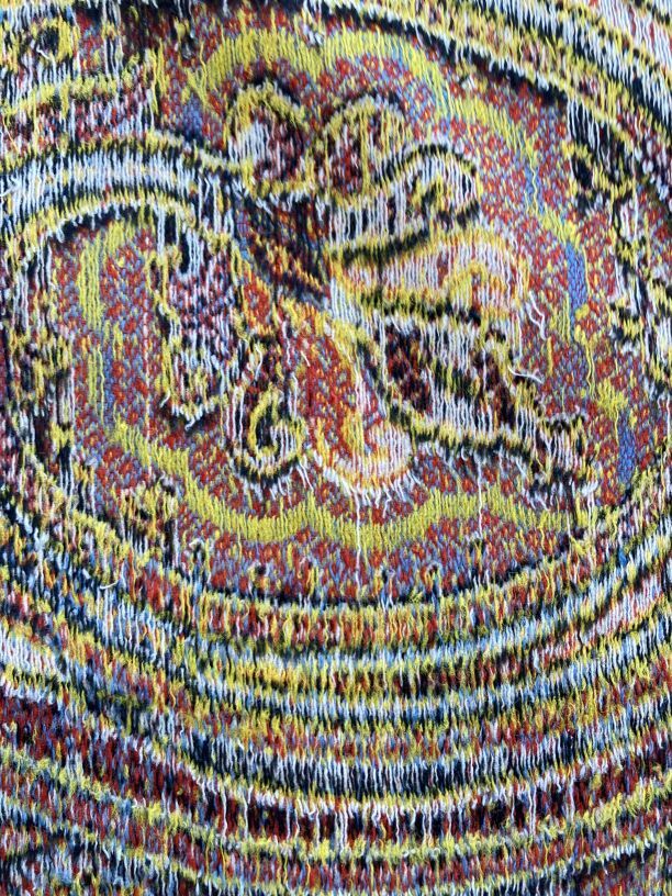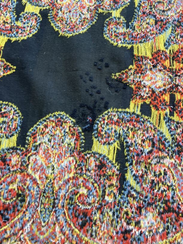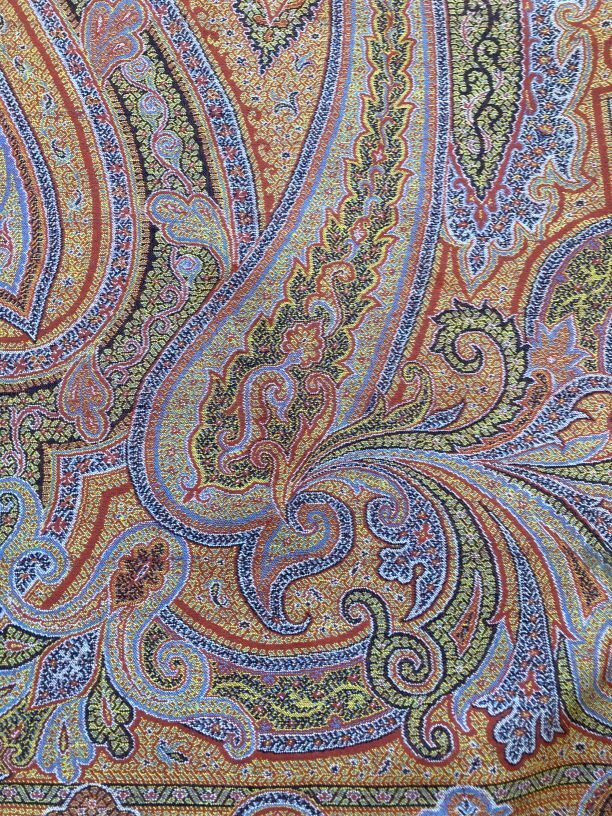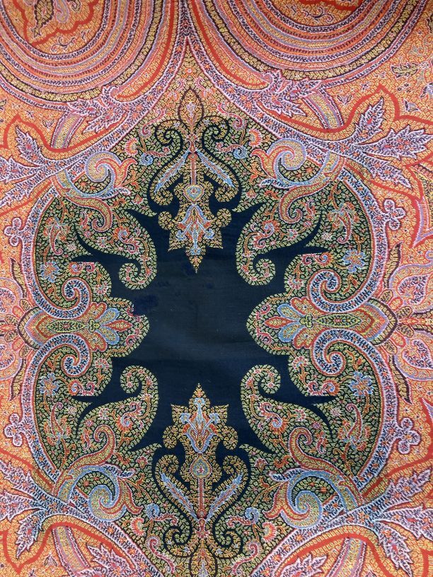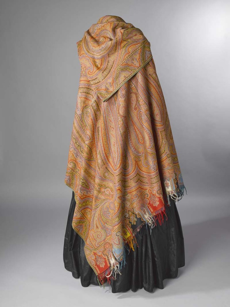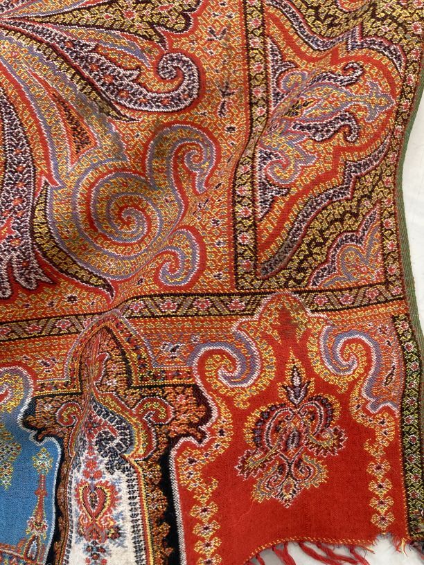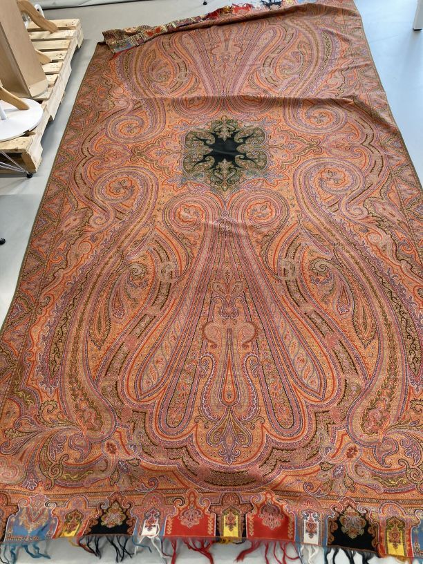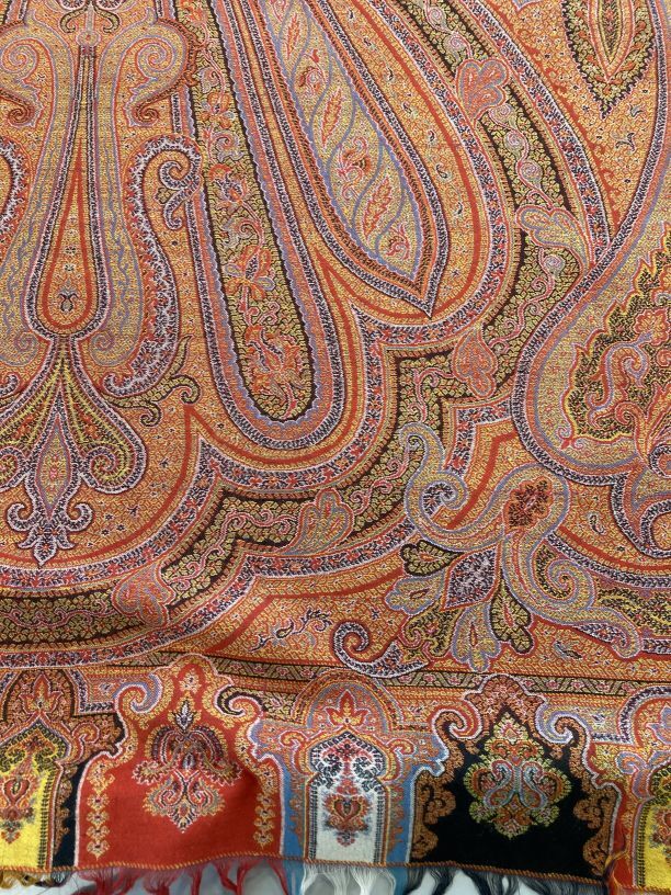 Omslagdoek van wol met ingeweven kasjmierpatronen, met 'harlekijn' rand
