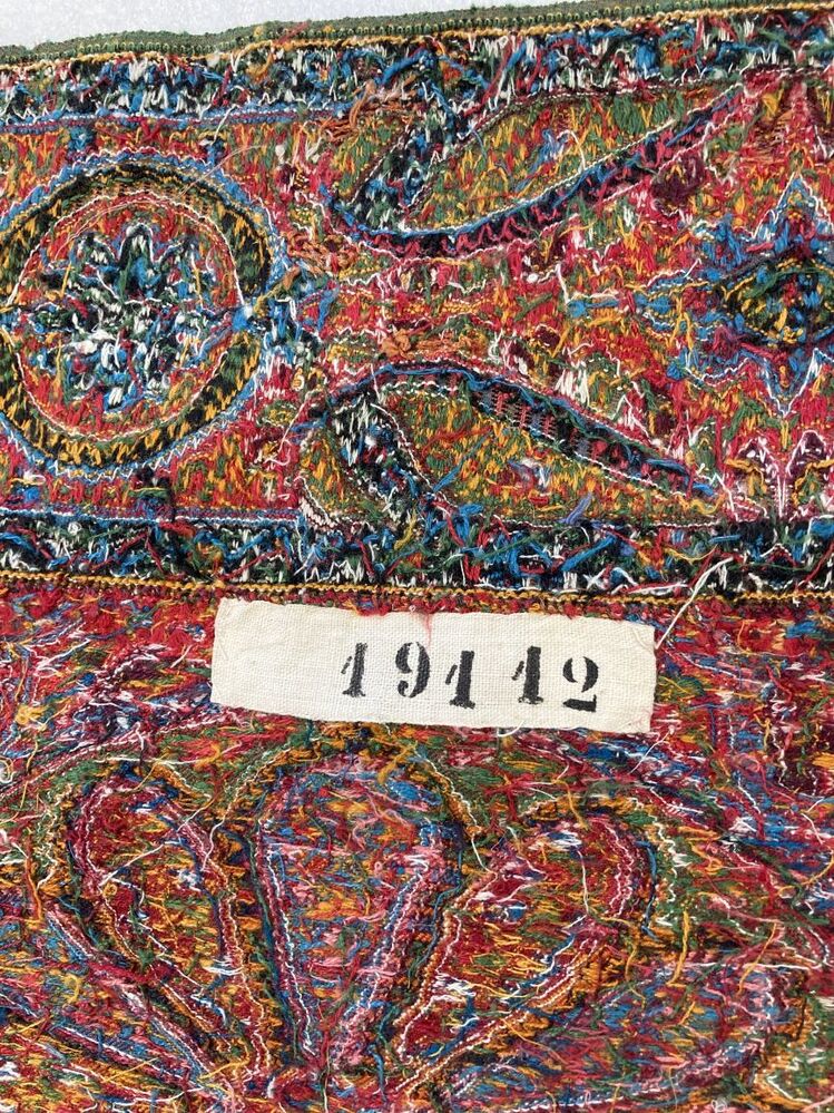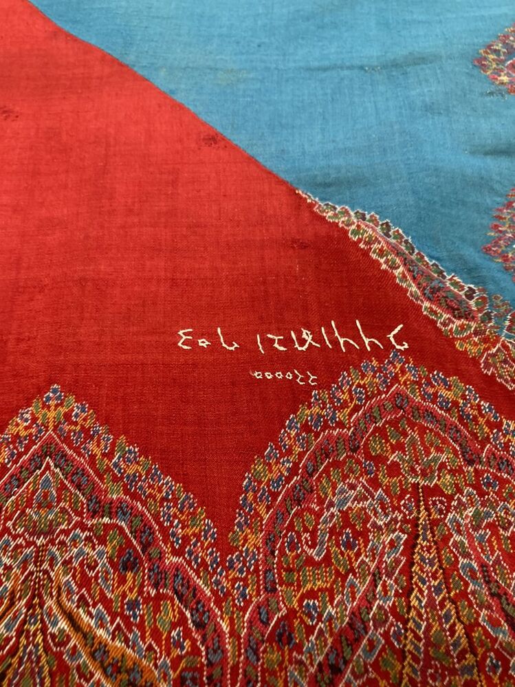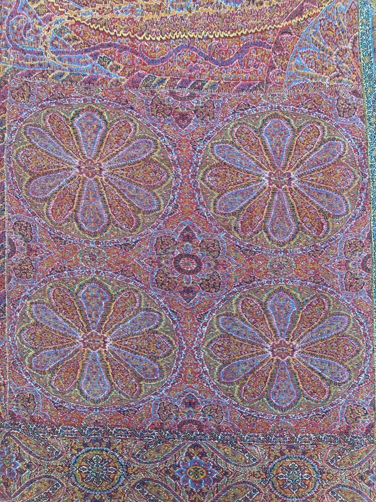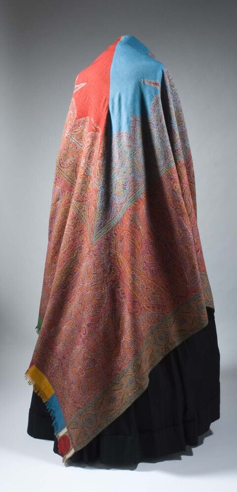 Veelkleurige kasjmier omslagdoek met buta motieven, met diagonaal gedeeld rood/blauw middenveld, samengesteld uit meerdere delen,