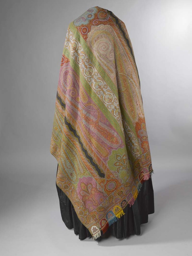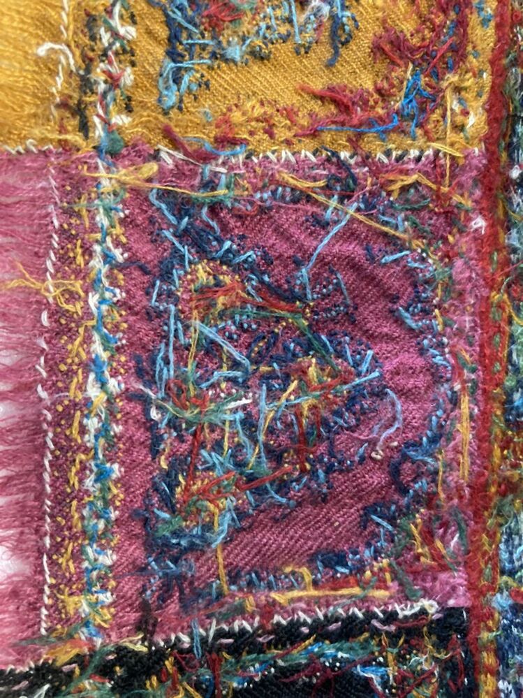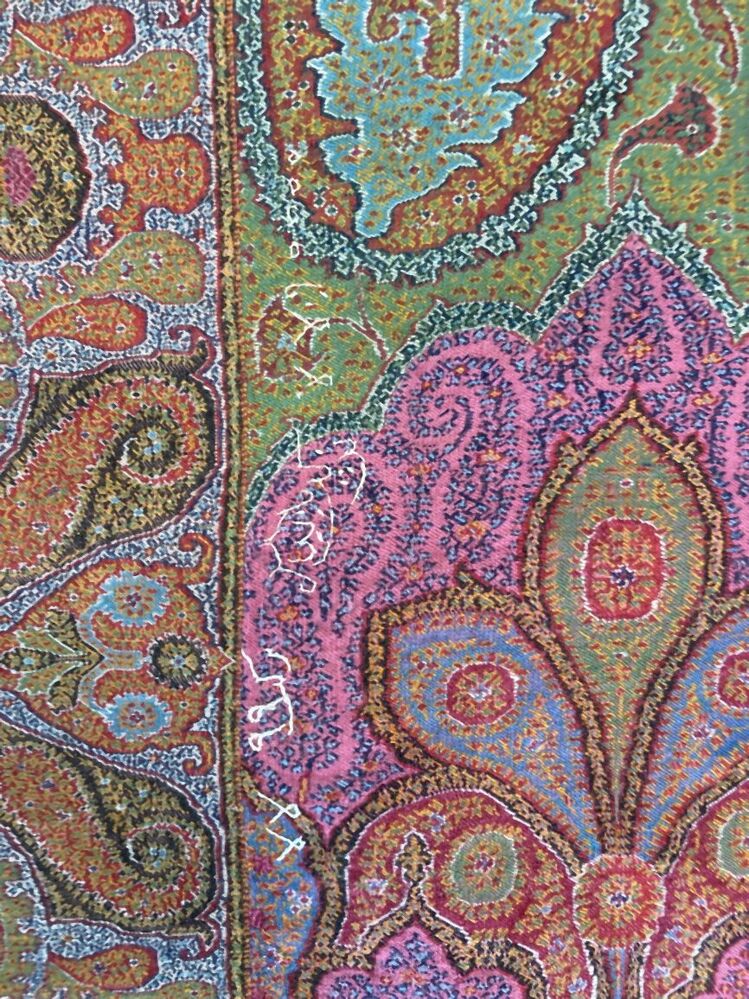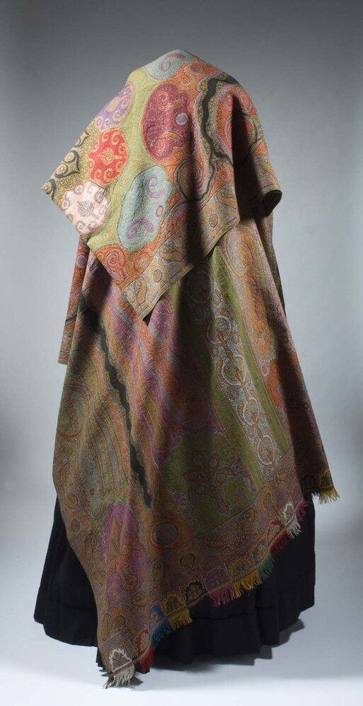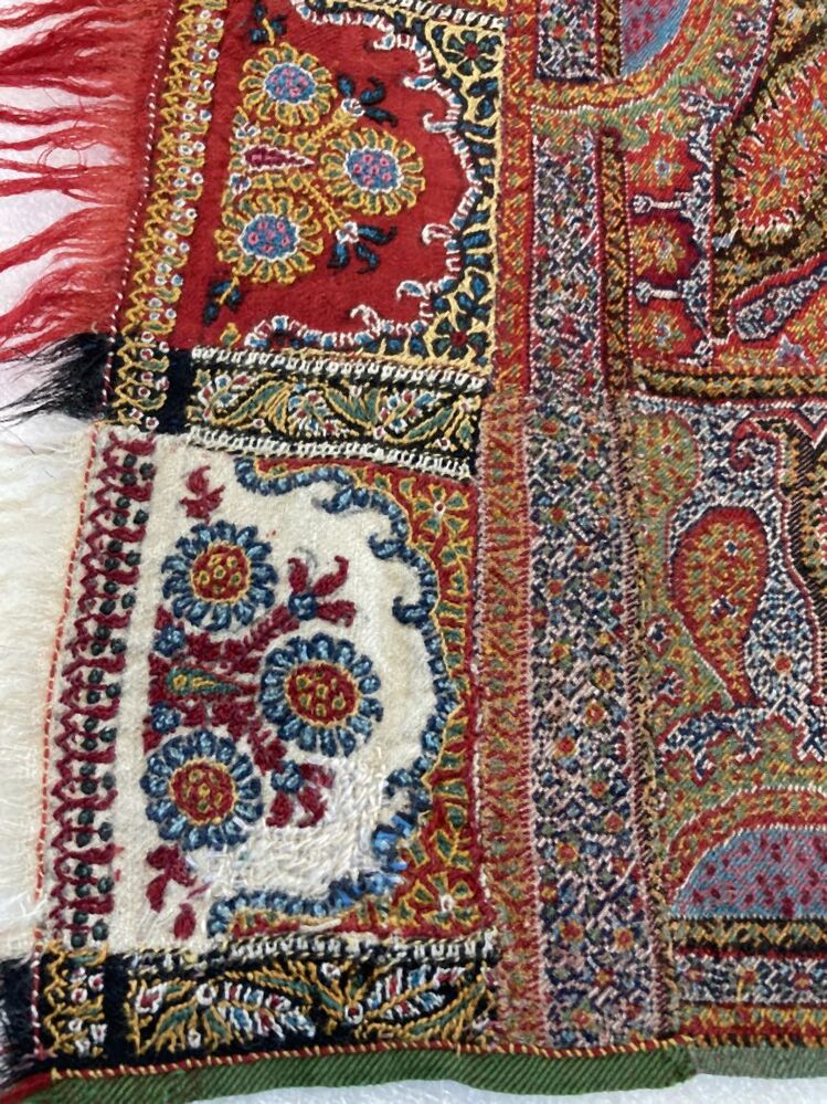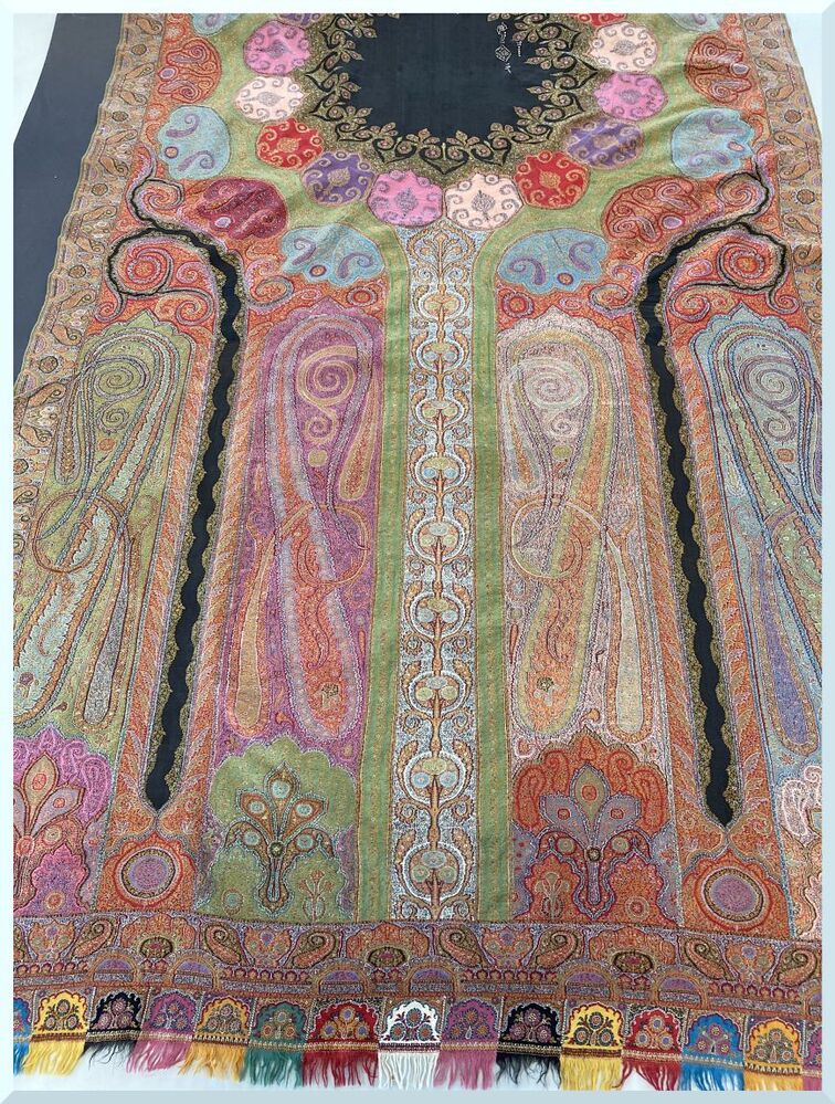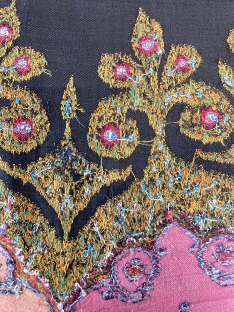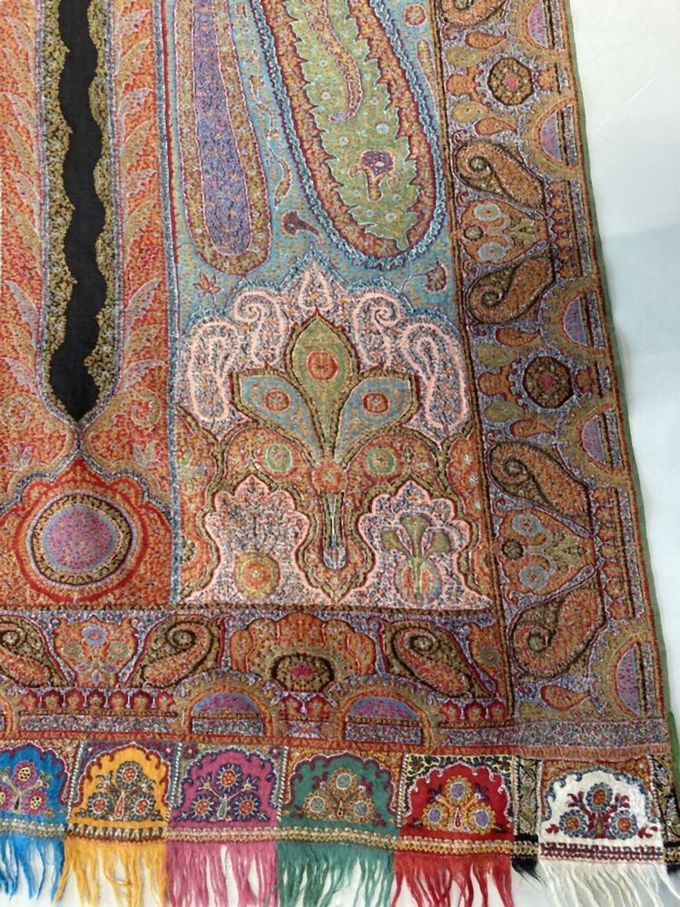 Kasjmier omslagdoek van gekleurde wol met met veelkleurige motieven, borduurwerk in de 'harlekijn'rand, in het midden een zwart rozet