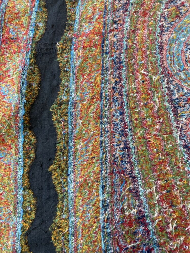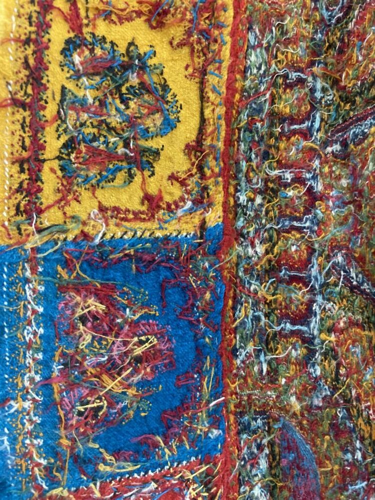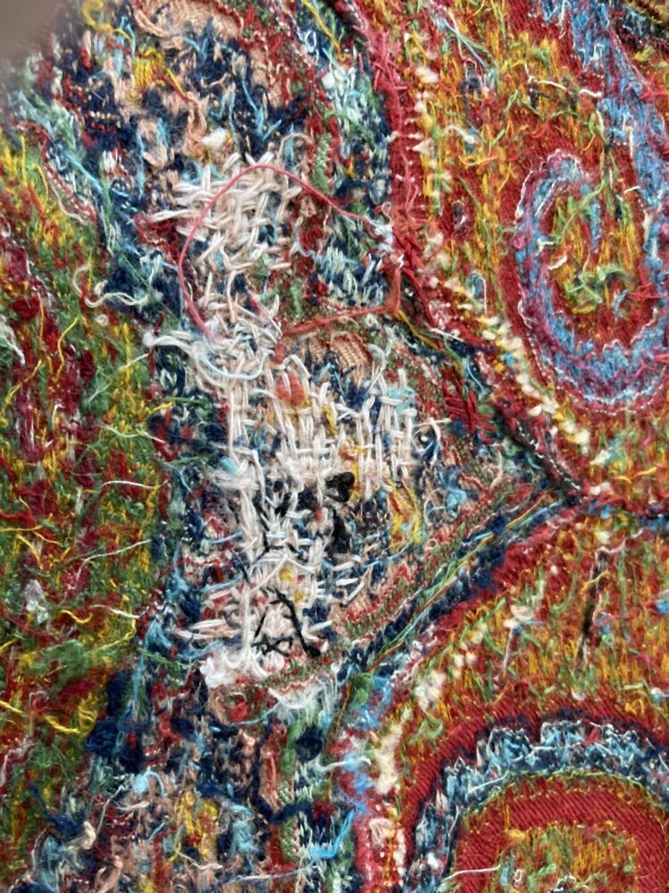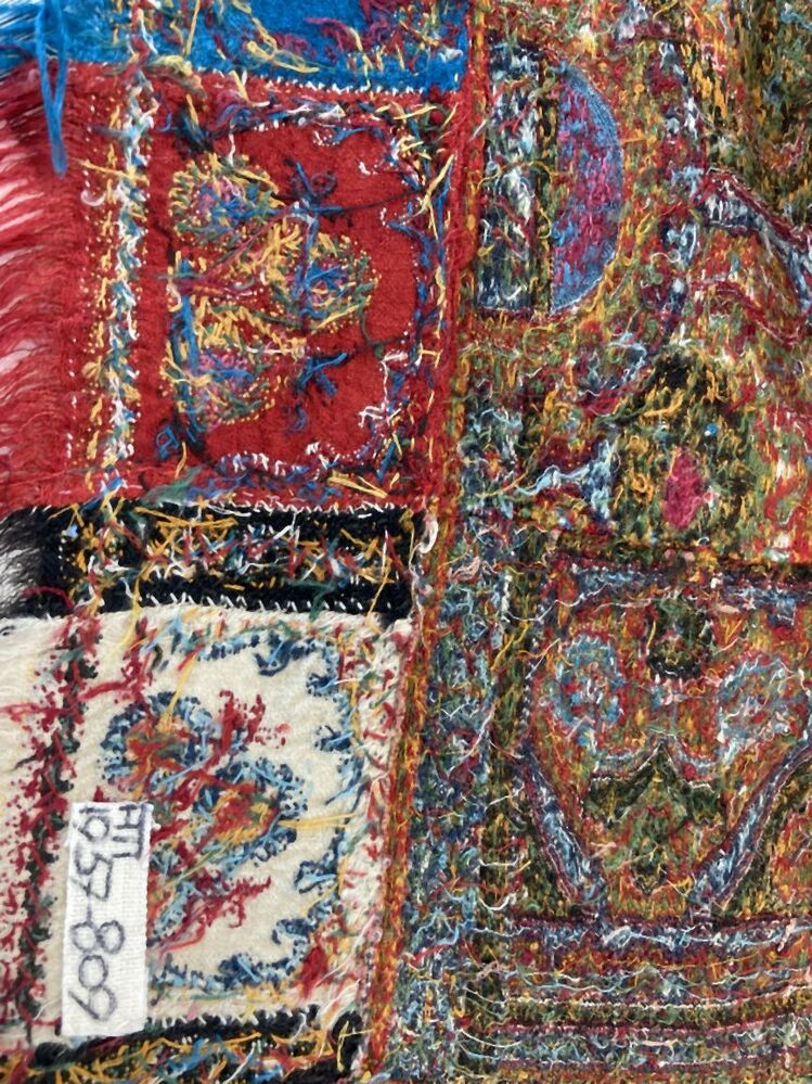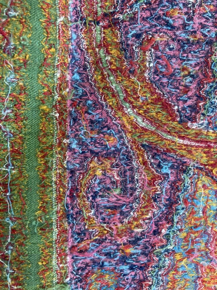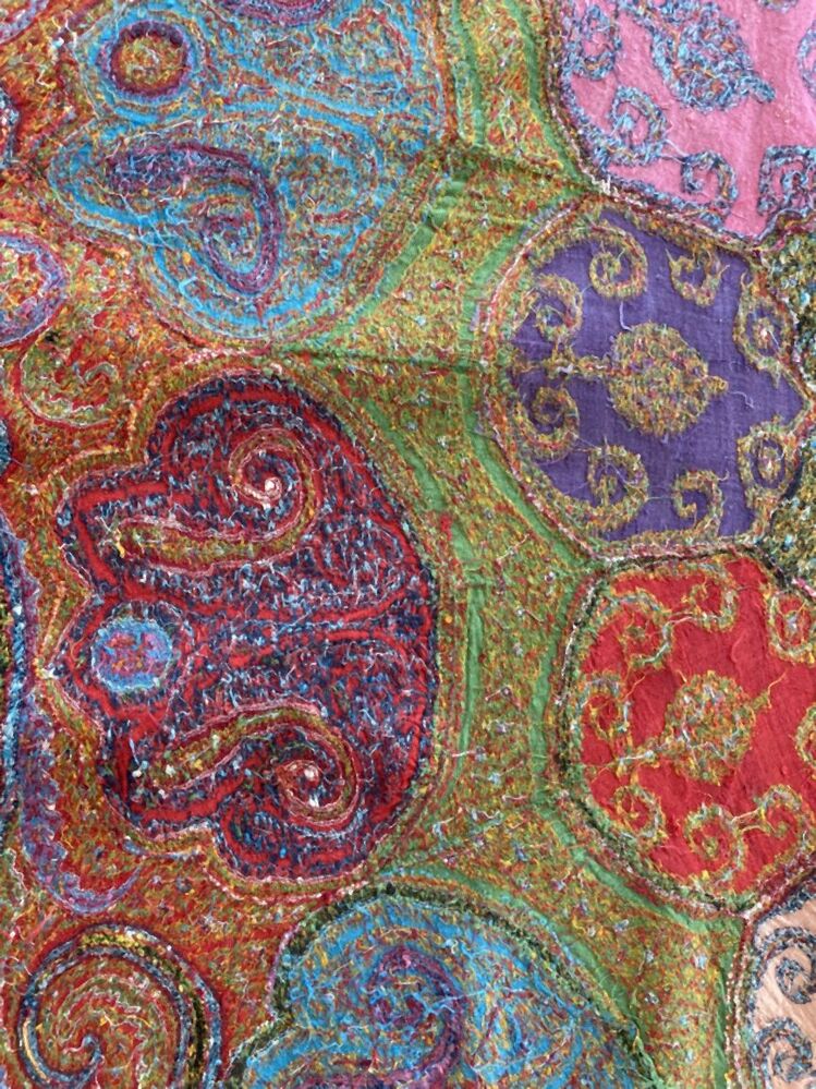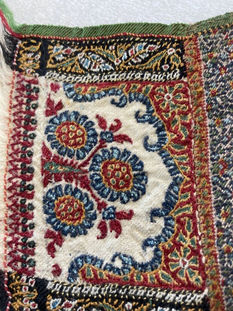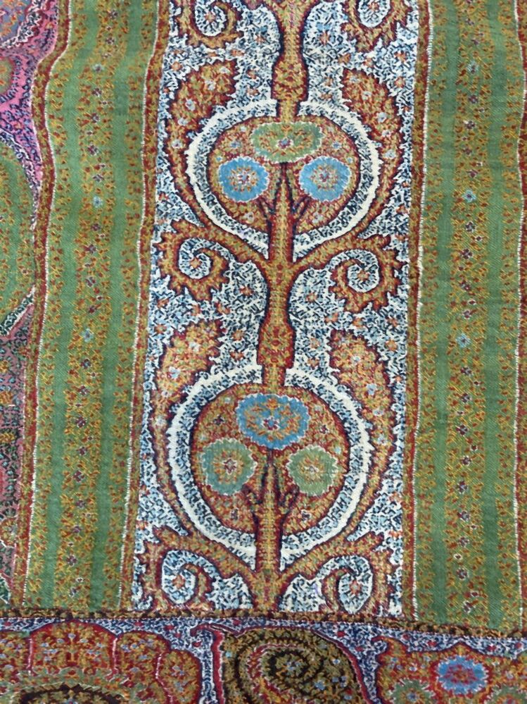 Kasjmier omslagdoek van gekleurde wol met met veelkleurige motieven, borduurwerk in de 'harlekijn'rand, in het midden een zwart rozet