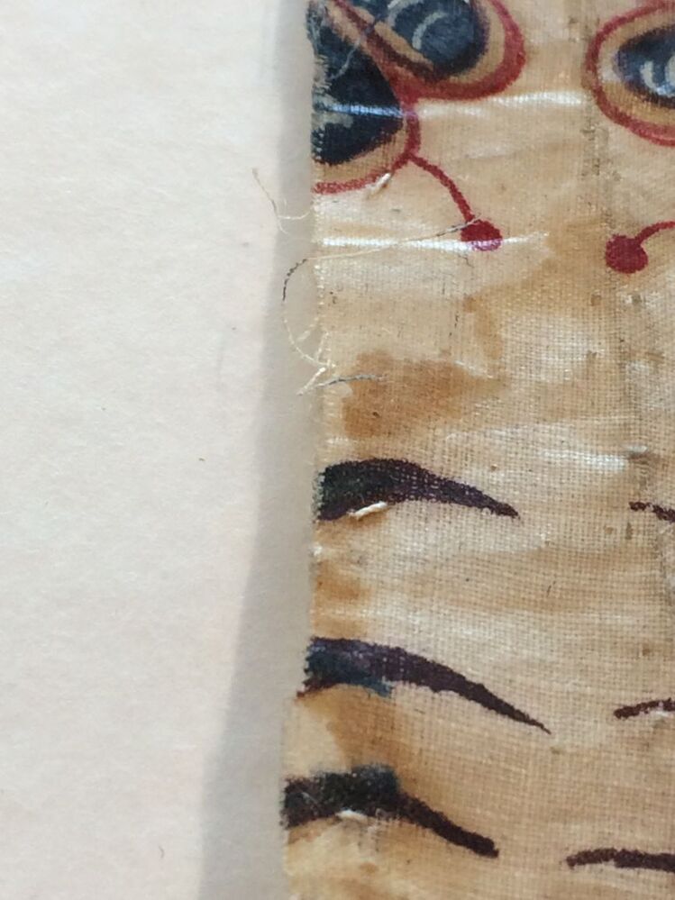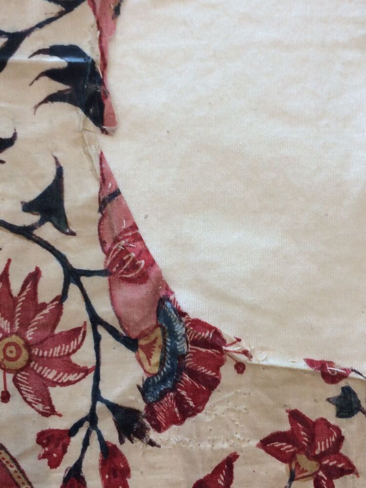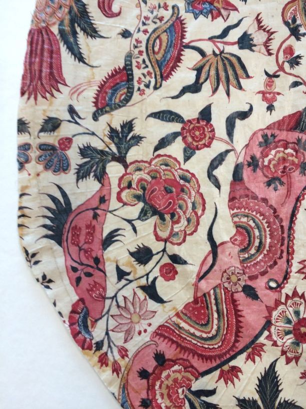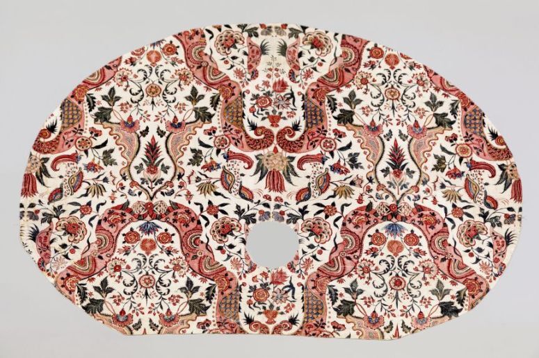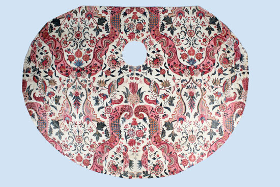Sitsen zonhoedvoering, symmetrisch patroon met roze golvende banden, waartussen diverse bloemmotieven op witte grond