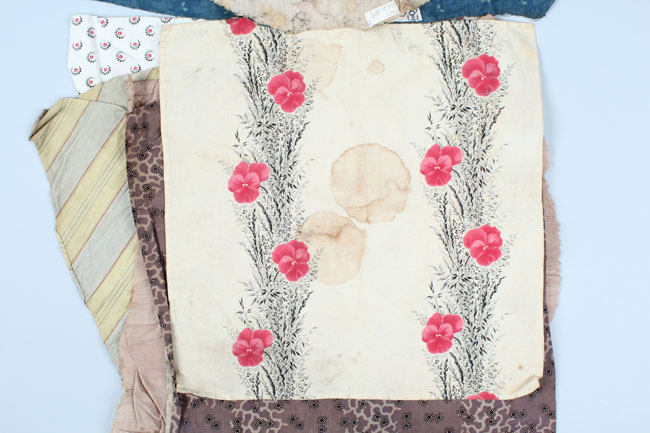 Lap stof bedrukt met forale motieven in banen, onderdeel van collectie van twaalf katoenen lappen