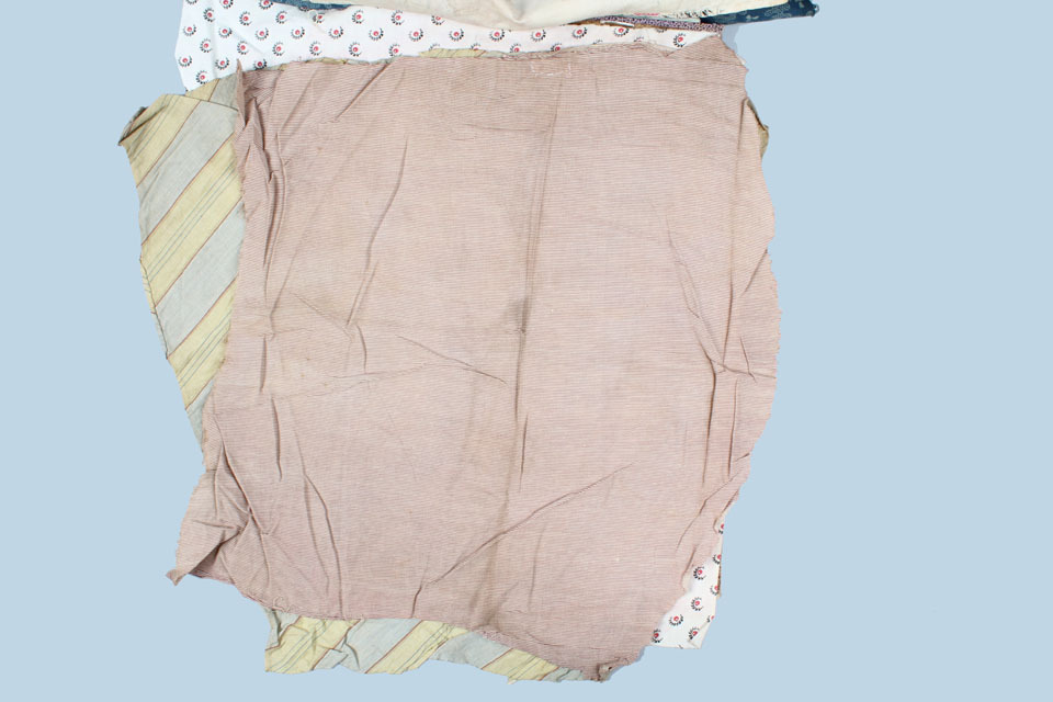 Lap stof, rood-ecru gestreept, onderdeel van collectie van twaalf katoenen lappen
