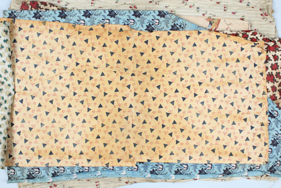 Lap stof bedrukt met geometrische motiefjes, onderdeel van collectie van tien lappen, merendeels van katoen