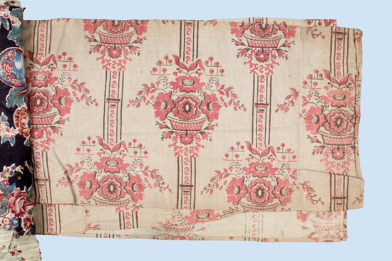 Zandkleurige geribbelde lap stof met roze bloemen vazen op zuilen, onderdeel van collectie van tien lappen, merendeels van katoen