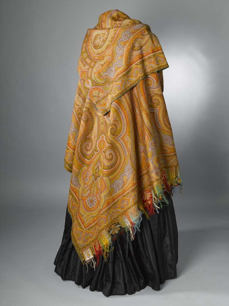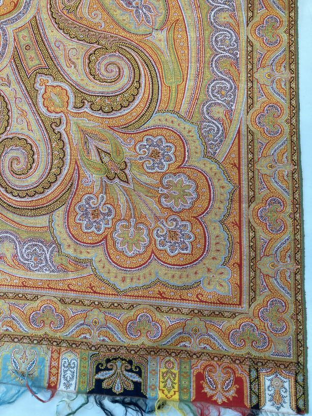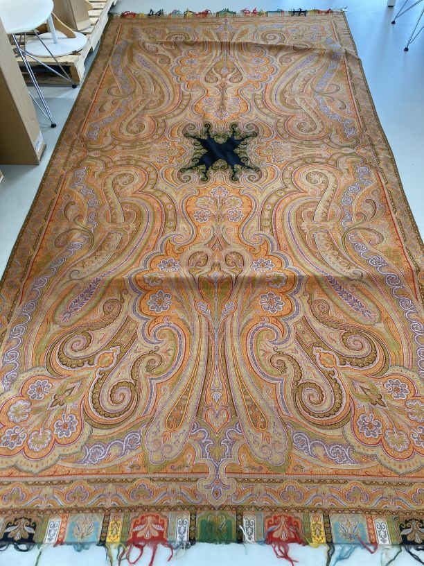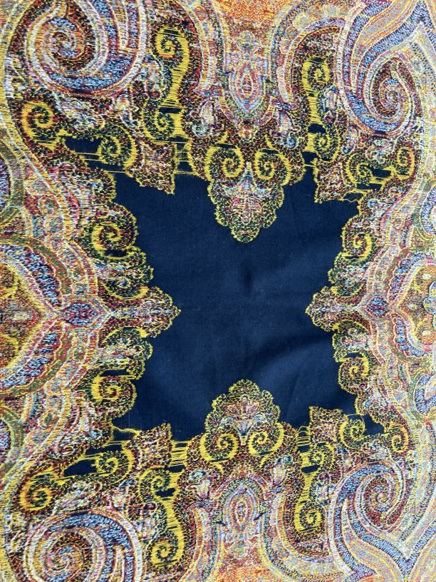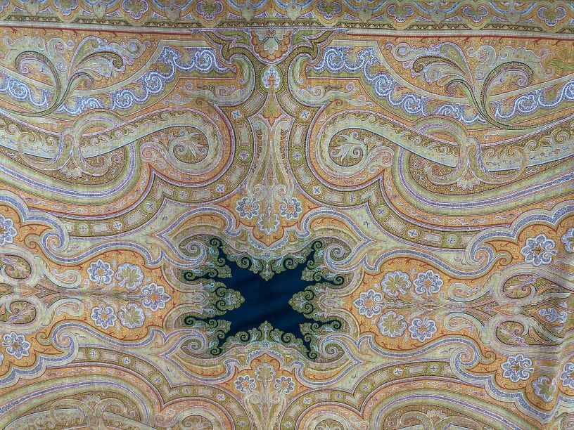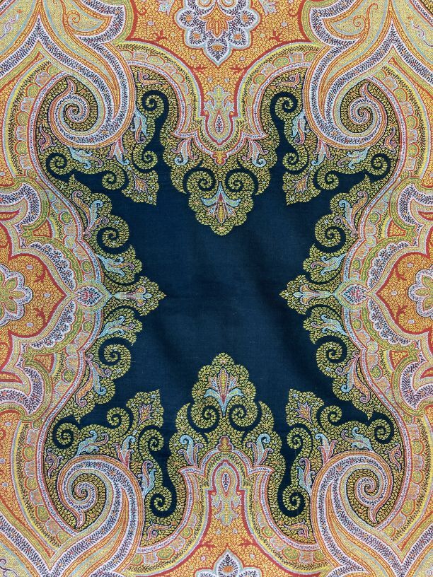 Kasjmier omslagdoek van gekleurde wol, om zwart middenveld zit een symmetrisch motief